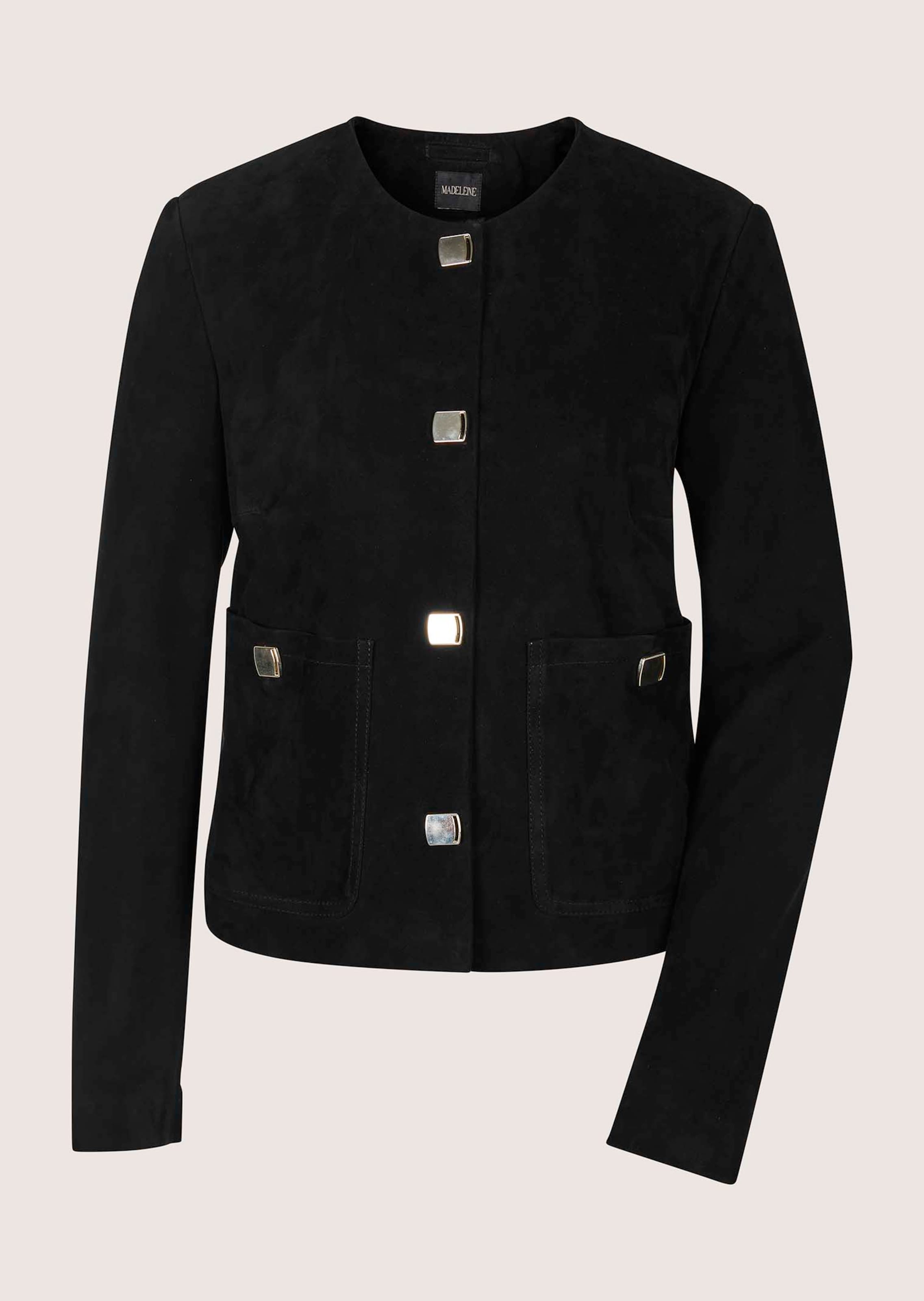 Man spürt es sofort: Ziegenveloursleder ist etwas ganz Besonderes. Fein, extrem weich und geschmeidig verkörpert das Material Eleganz, Luxus und Qualität zugleich. Die klar geschnittene Form ohne Kragen, die glänzenden Schmuckknöpfe und die aufgesetzten Taschen machen die Jacke zum Highlight für puristische Looks. Der modisch verkürzte Schnitt wirkt modern und feminin zugleich. Styling-Tipp: Kombinieren Sie die Lederjacke doch mal anstelle eines Blazers zur Bundfaltenhose oder zum Etuikleid.