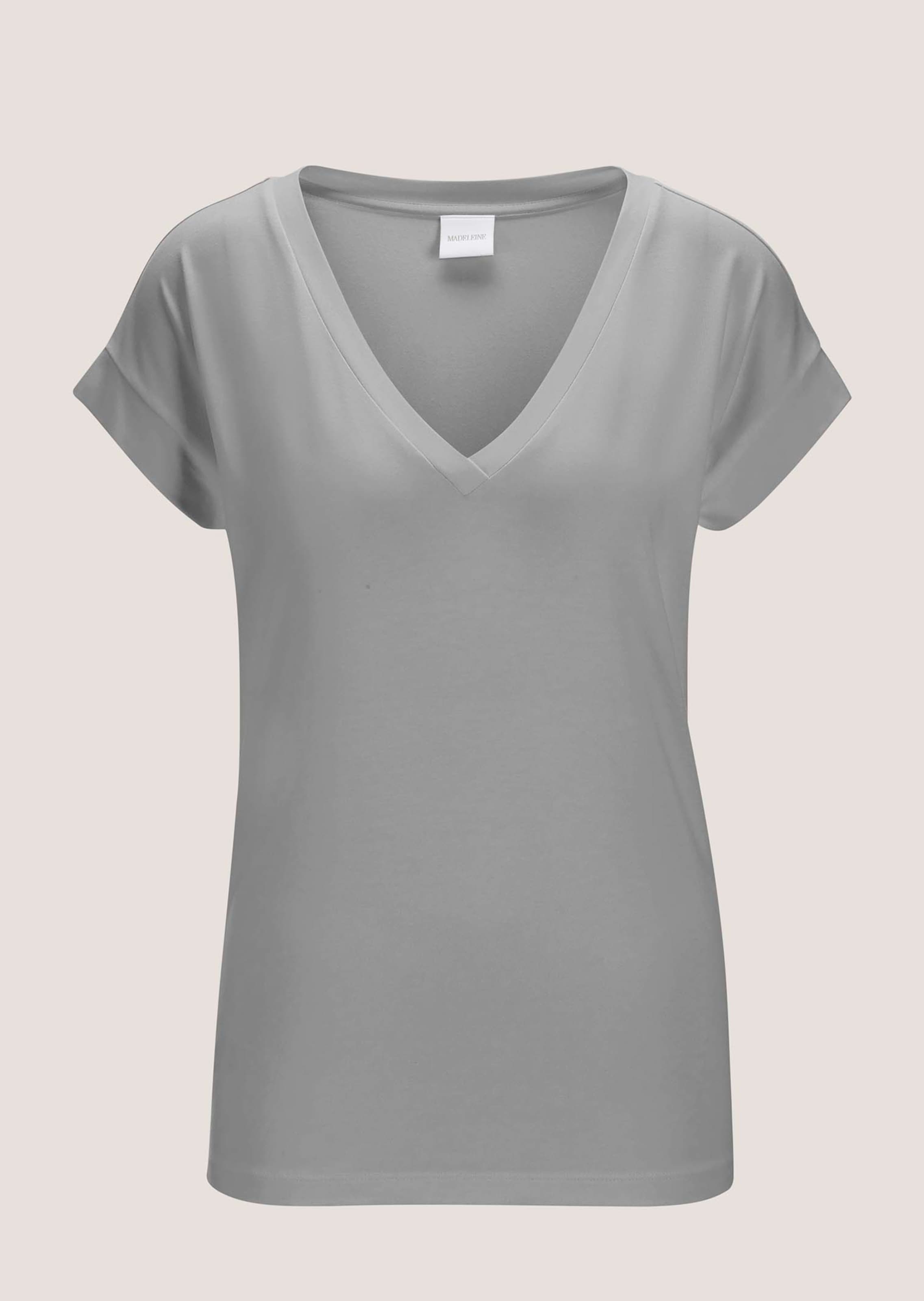 Das Basic-Shirt schmeichelt Ihrer Haut in vielen, schönen Trendfarben. Die geschmeidige Qualität verwöhnt mit dem edlen Glanz von Viskose und dem angenehmen Komfort von Elasthan – eine gelungene Material-Kombination, die Sie nicht nur einen Sommer lang begeistert. Pur im Look zeigt sich das Shirt in moderner Lässigkeit und ist mit V-Ausschnitt und überschnittener Schulter mit breiten Abschlussblenden gestaltet. Ein perfektes Basic, das zu vielen Styling-Ideen inspiriert – ob sportlich relaxed für die Freizeit, lässig elegant für die City oder als Unterzieher unter Blazer oder Gehrock im Büro.