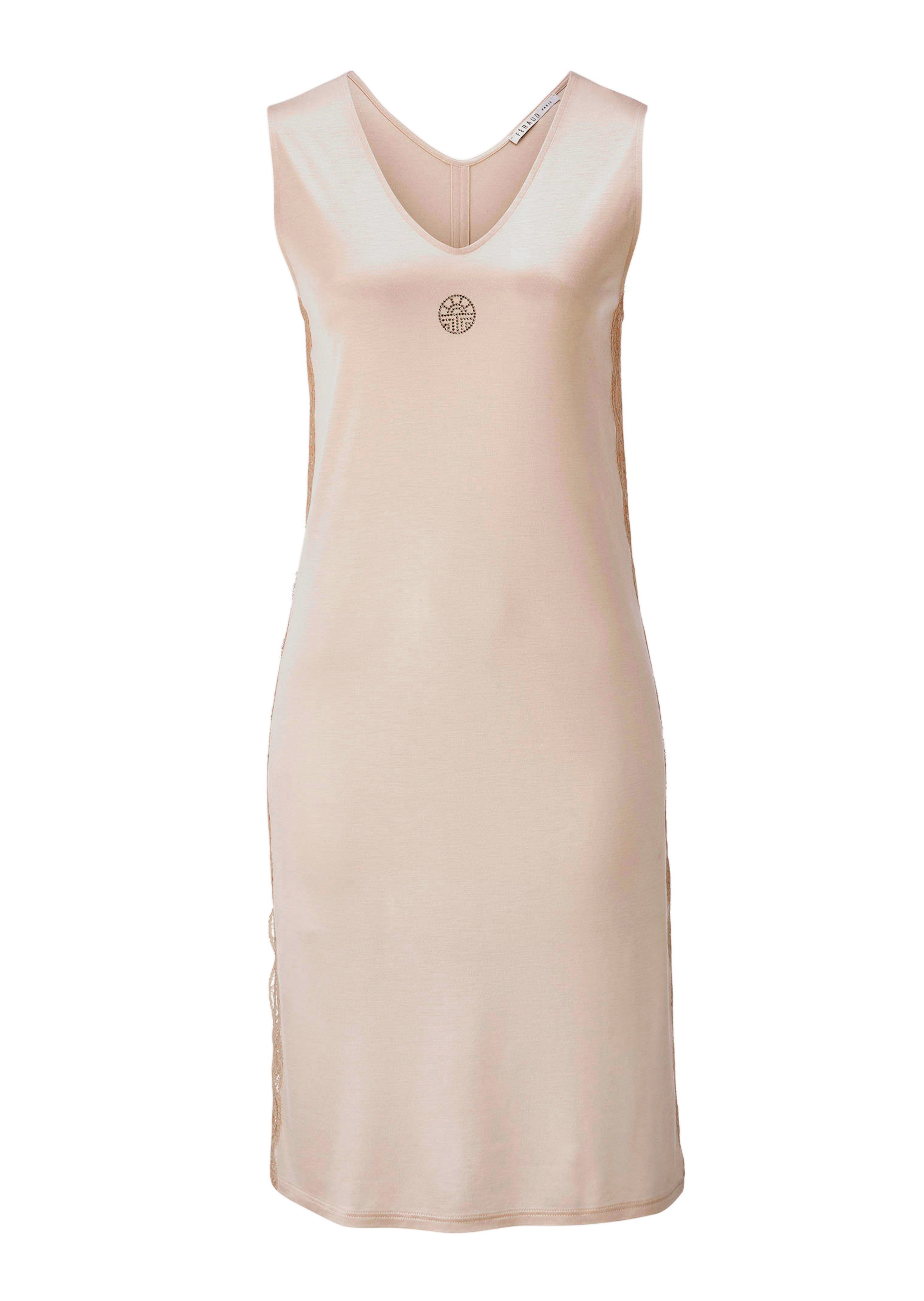 Seidig-weiche Eleganz für besondere Momente bringt dieses Negligé von FERAUD. Die hochwertige Micromodal-Seiden-Mischung schmiegt sich angenehm an die Haut und glänzt dezent. Breite Spitzen an den Seitennähten und ein zartes Glitzerstein-Motiv am Vorderteil setzen elegante Akzente. Der V-Ausschnitt und die rückseitige Teilungsnaht strecken die Silhouette, zwei Seitenschlitze sorgen für Bewegungsfreiheit.