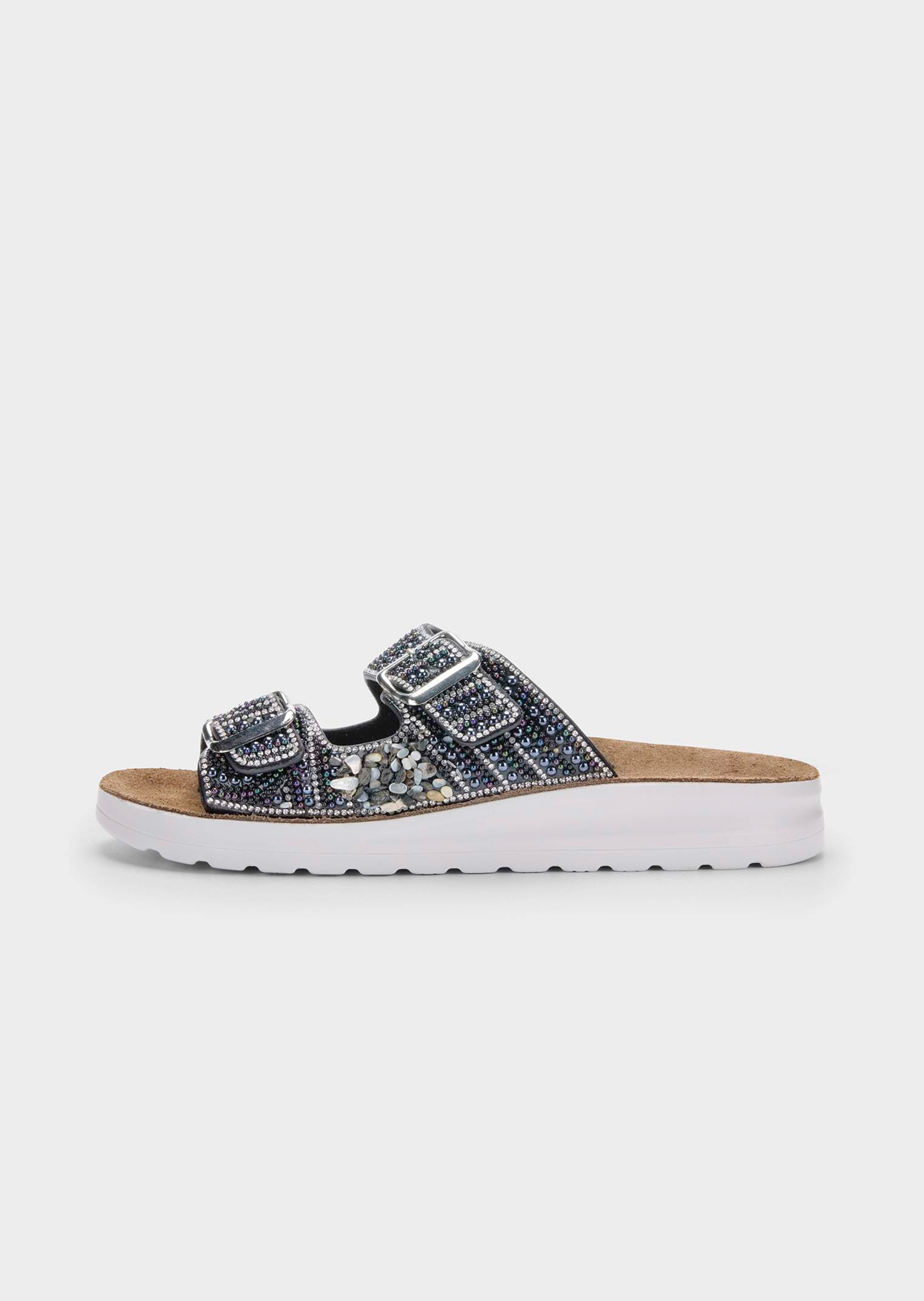 Das aufwendig verzierte Design mit Strasssteinchen und kleinen Schmuckperlen macht diese Pantolette zu einem echten Hingucker. Zwei verstellbare Schließen garantieren einen perfekten Sitz, während das weiche Aerosoft-Fußbett und die Leder-Decksohle ein angenehmes Laufgefühl bieten. Die AntiShock-PU-Sohle dämpft jeden Schritt – perfekt für Urlaub, Freizeit oder entspannte Sommertage. Gefertigt in Italien, kombiniert diese Pantolette edles Design mit hochwertiger Verarbeitung.