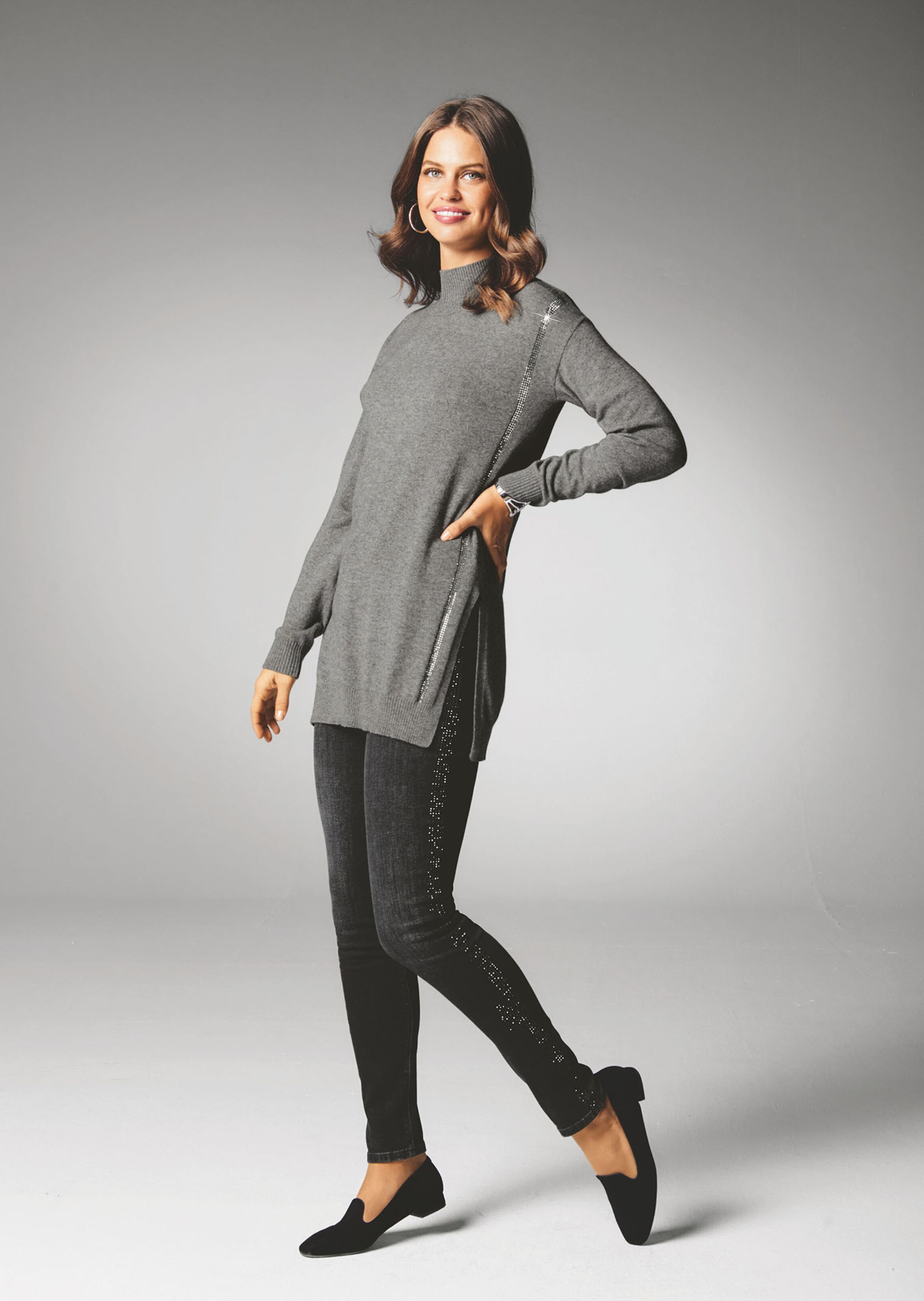 Sein wertvoller Effekt lenkt den Blick auf die Seiten! Der Pullover mit Glitzersteinen zeigt im Longstyle Lässigkeit. Die kostbare, seitliche Steinchendekoration zieht sich vom gerippten Stehkragen bis zum Saum. Der lässige Style ist in gerader Form mit überschnittenen Schultern, Rippenabschlüssen, Langarm und langen Seitenschlitzen gestaltet. Der in Form gestrickte Flachstrick trägt sich angenehm. Durch die Farbgebung können Sie ihn vielseitig kombinieren – einmal elegant und ein anderes Mal lässig.
