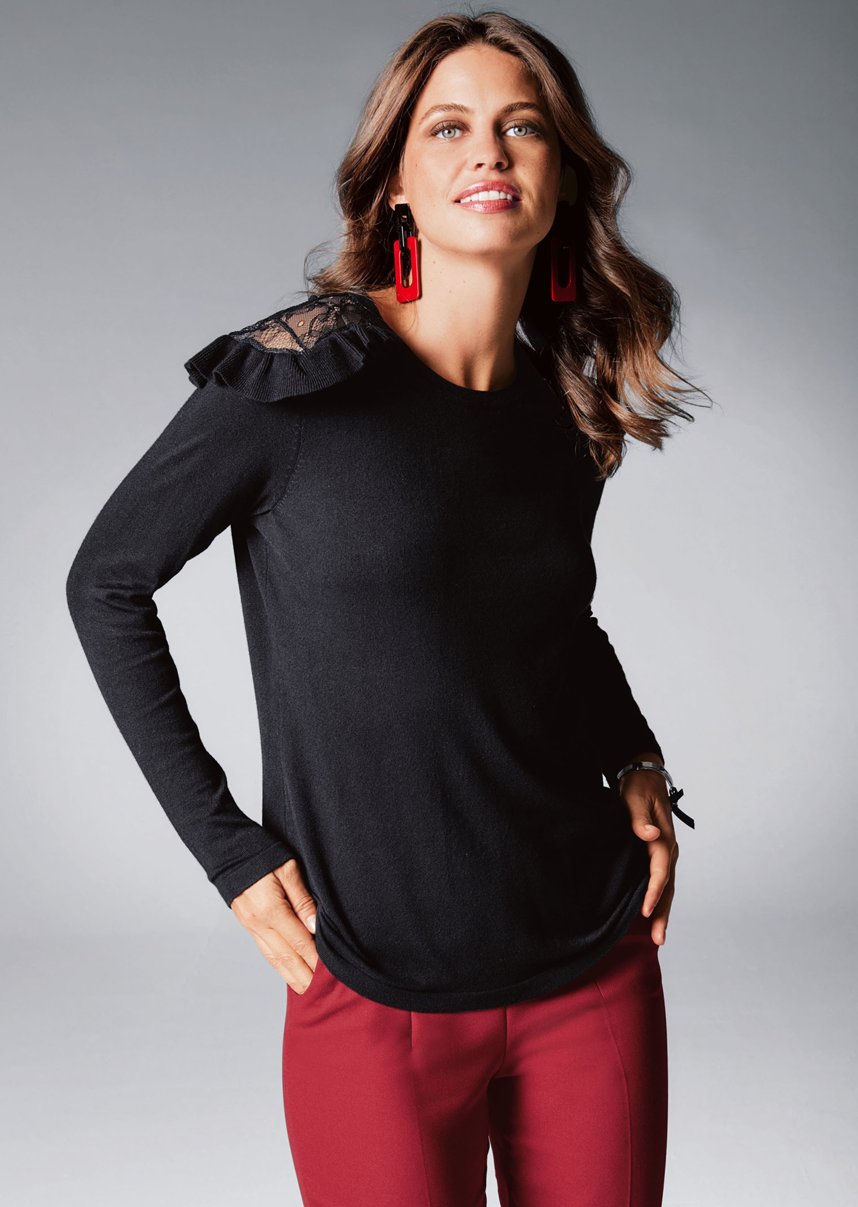Hier rückt die Schulter in den Fokus! Der Pullover mit Rüschen wirkt so feminin und elegant durch die verspielte Schulterpartie mit zusätzlicher Spitze. Der in Form gestrickte Glattstrick wirkt schlicht entgegen. Wir haben den Strickpullover für eine schlanke Linie in leicht taillierter Form mit hohem Rundhalsausschnitt und Langarm gestaltet. Durch seine klassische Farbe können Sie ihn vielseitig kombinieren – am Tag sowie am Abend.
