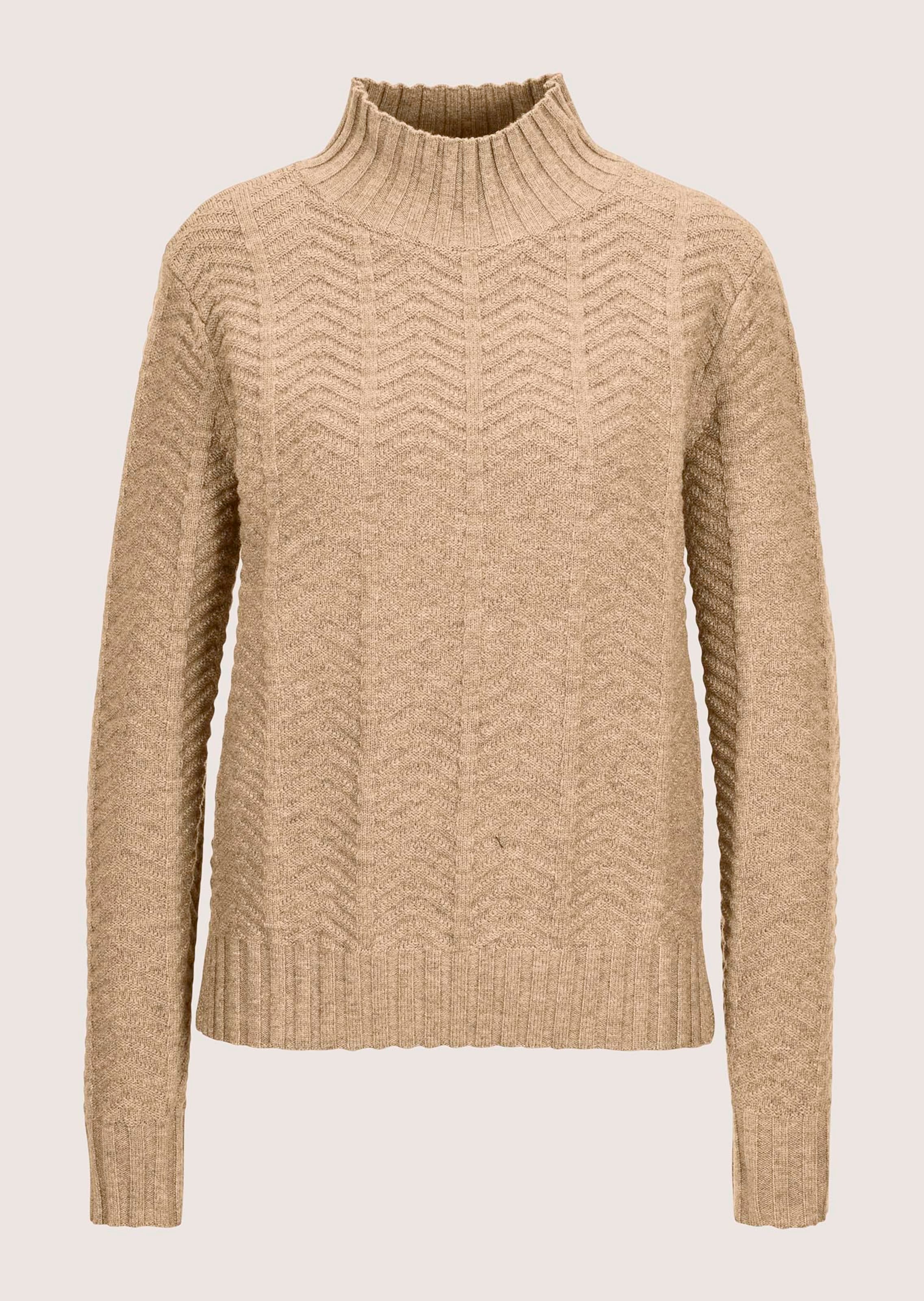 Ein Maschen-Look, der Eleganz und Detailverliebtheit sehenswert kombiniert. Fein gearbeiteter Strukturstrick an Vorderseite und Ärmeln verleiht dem Pullover eine Prise Raffinesse und unterstreicht seine gepflegte Ausstrahlung. Im Kontrast dazu steht die glatt gestrickte Rückseite, die dem Look optische Ruhe und stilvolle Ausgewogenheit schenkt. Der Stehkragen liegt angenehm weich am Hals. Wie Ärmelabschlüsse und Saumkante sorgt er in formstabilem Rippstrick für klare Konturen und eine zuverlässige Form.