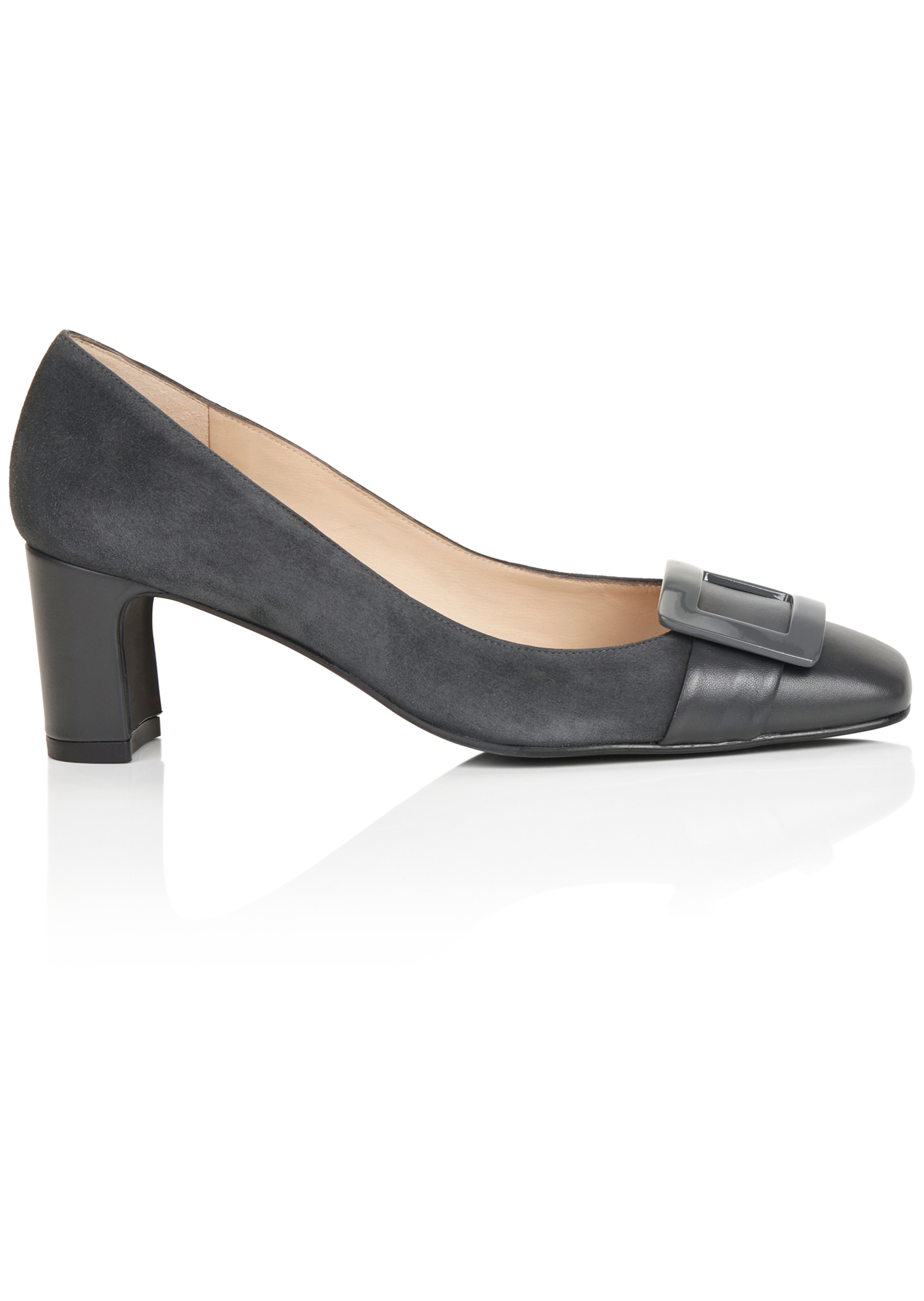 Dieser neu interpretierte Pumps lässt gekonnt die Eleganz der Sixties wieder aufleben. In modisch eckiger Form und einem Mix aus Velours- und Glattleder wird er zum Must Have anspruchsvoller Ladies und Trendsetterinnen. Die eckige Zierspange und der Absatz in bequemer Höhe unterstreichen den stilvollen Auftritt. Das Prädikat »Handgefertigt in Spanien« steht für erstklassige Qualität und Ausstattung: Mit Lederfutter, Lederdecksohle und flexibler Laufsohle ist ein perfektes Laufgefühl garantiert. Ein modisches Keypiece, das zur vielen Teilen Ihrer Garaderobe passt – edel und stilvoll zur Tuchhose, superfeminin zum Kleid.
