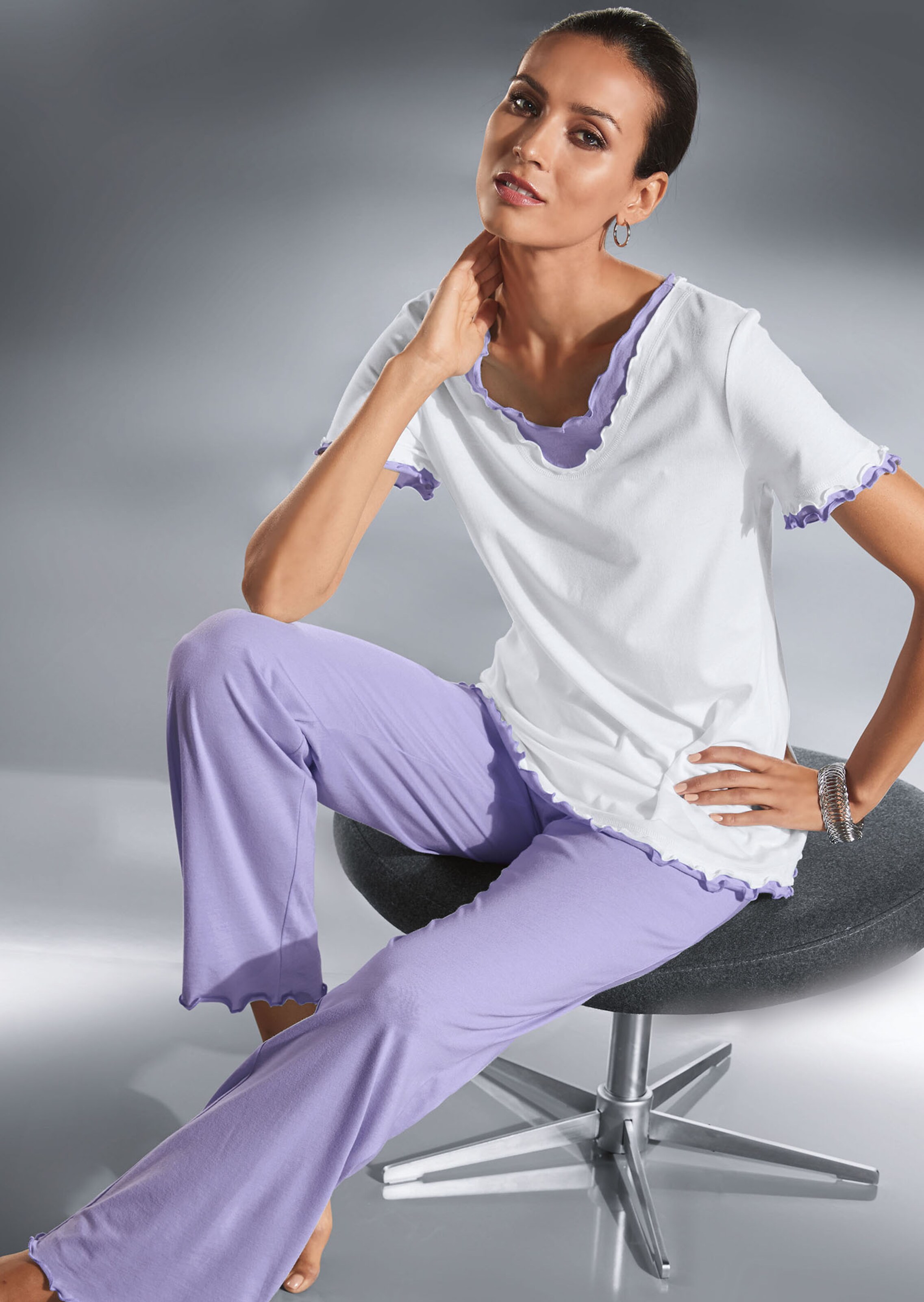 in raffinierter Lagenoptik mit dekorativen Wellensäumen. Shirt in leichter A-Linie mit 1/4 Arm und formschönem Ausschnitt. Hose mit Elastikbund und Wellensaum.