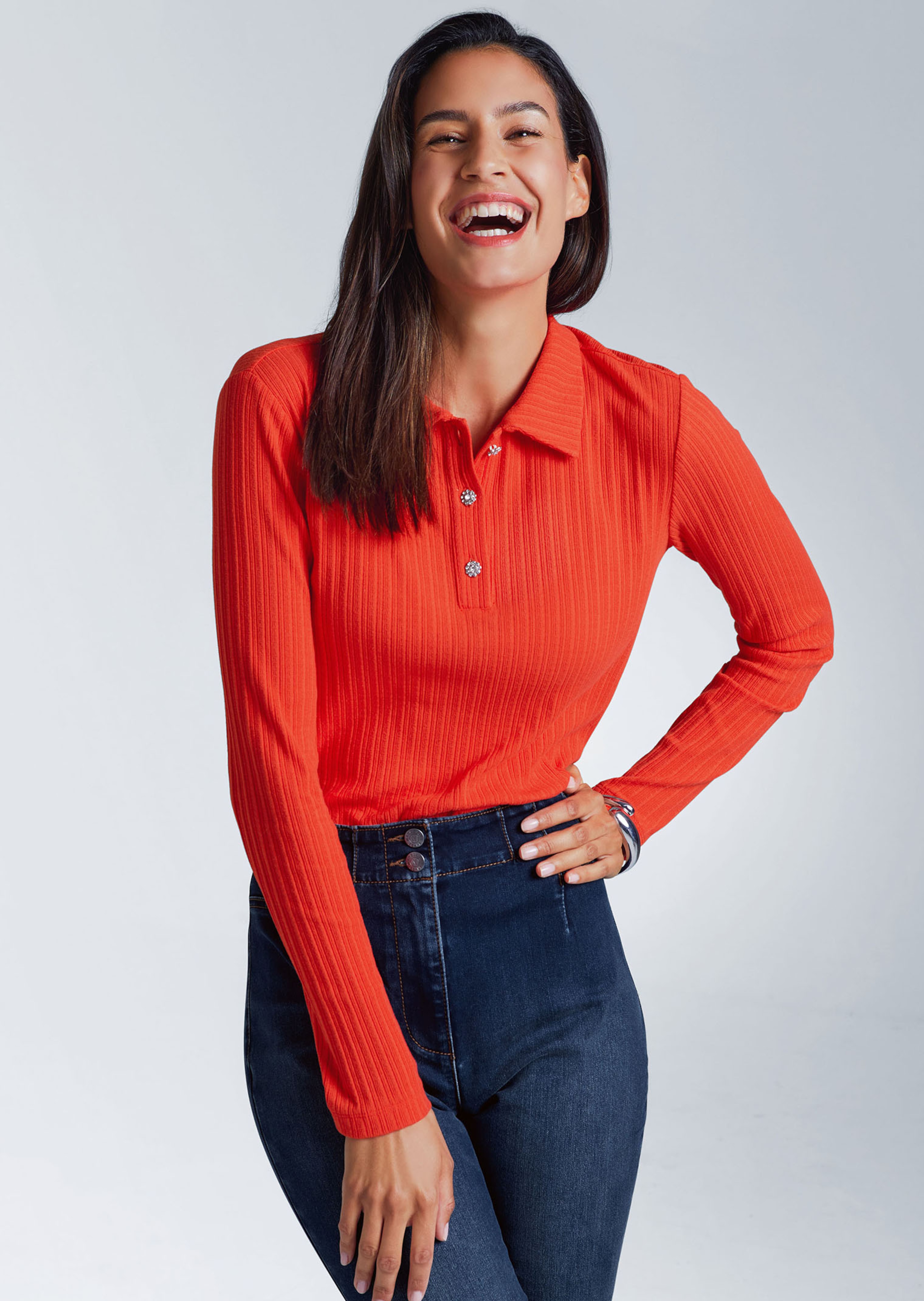 Sportive Eleganz setzt Statements! Das Rippshirt mit Knopfleiste trägt sich so angenehm durch den elastischen Cotton-Mix. Der schlanke Style ist mit Polokragen, Schmuckknöpfen und Langarm gestaltet. Ein vielseitiges Basic-Shirt, das Sie sowohl elegant als auch lässig kombinieren können.