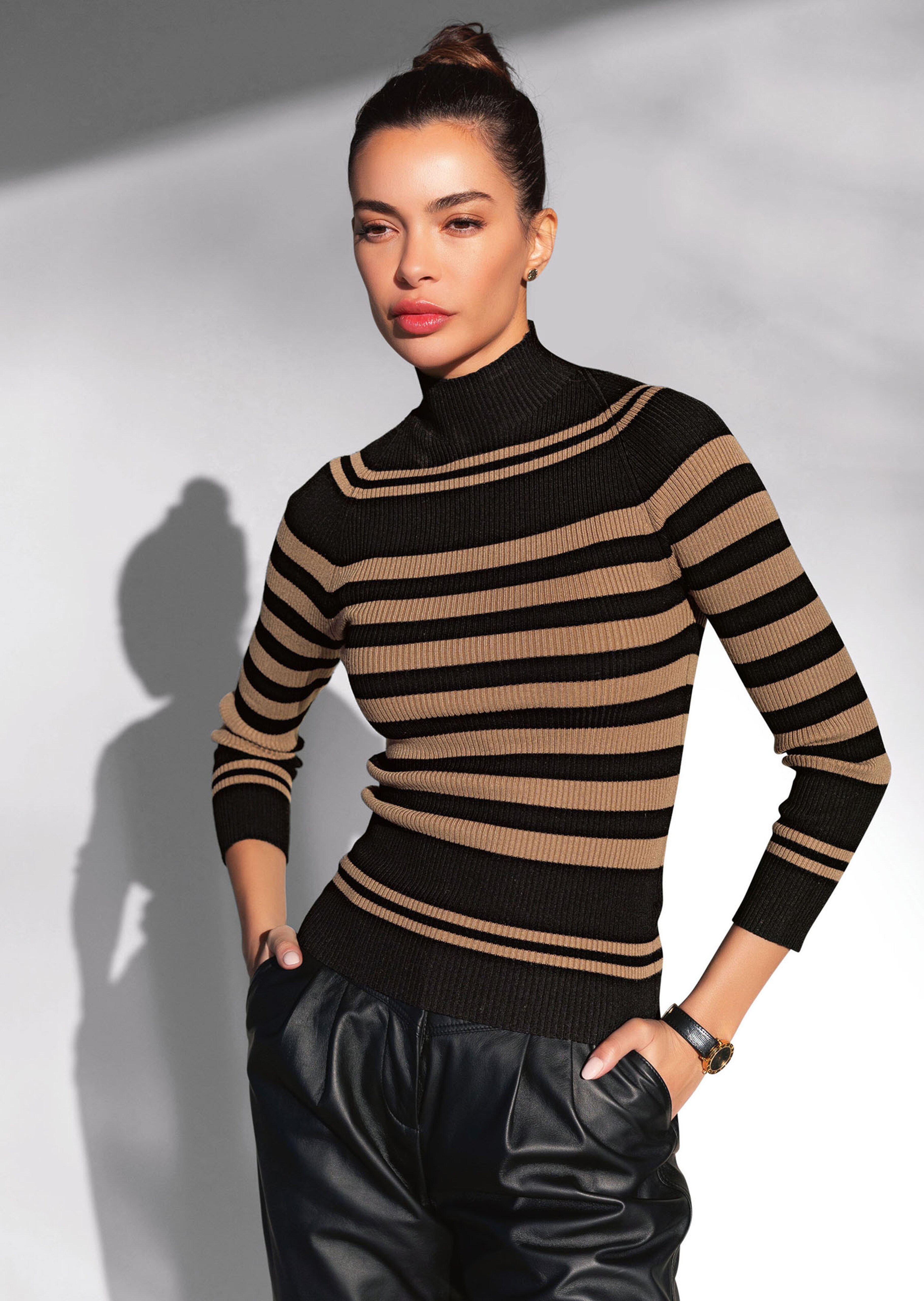 Seine schlanke Linie ergibt zusammen mit den gekonnt gesetzten Streifen einen fantastischen Effekt. Der Rippstrickpullover mit Streifen trägt sich durch den Viskose-Mix herrlich angenehm und hat einen schönen, weichen Griff. Der schlanke Style mit Stehkragen und Raglanarm zeichnet eine schöne, schmale Linie und feminine Silhouette. Durch die Farbkomposition können Sie den engen Pullover gut kombinieren – zu natürlichen Tönen oder ganz elegant zu Schwarz.