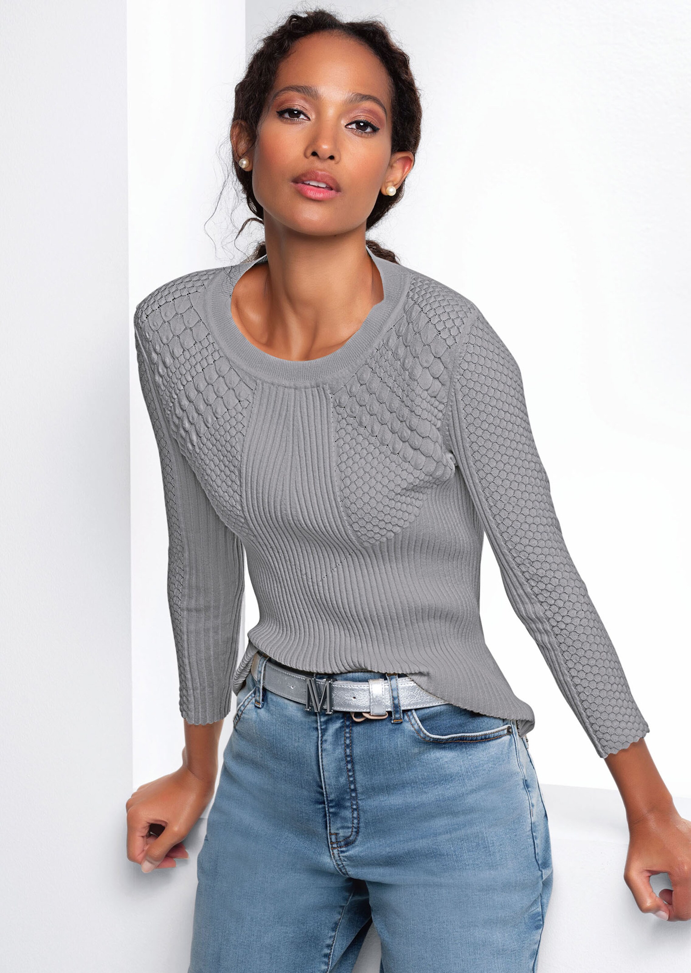 Strickkunst in Perfektion: Der Rippstrickpullover in kunstvoller Ripp- und Kroko-Struktur-Mix fasziniert mit seiner Optik. Der geschmeidige Strick aus hochwertigen Garnen im Viskose-Mix trägt sich wunderbar angenehm auf der Haut. Ein hübsches Extra sind die modern gestalteten Abschlusskanten. Sein schlanker Style ist mit 3/4-Arm und Rippenbündchen am Rundhalsausschnitt gestaltet. Ein Pullover, der Raffinesse in entspannte Stylings bringt und sich perfekt zu Denim & Co. kombinieren lässt.