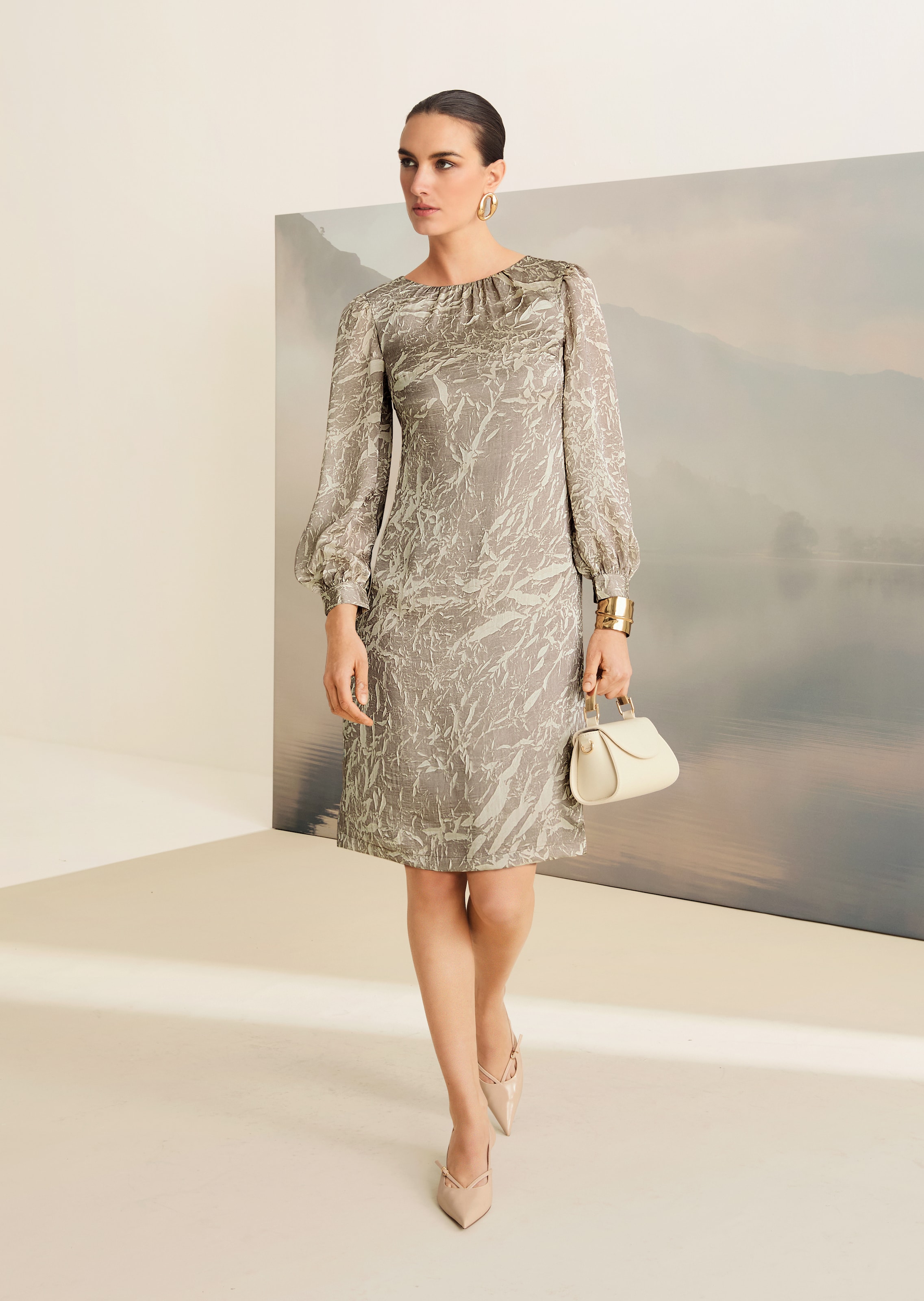 Ein trendstarker Einteiler für viele Gelegenheiten, der mit aufregender Crash-Struktur und attraktivem Two-Tone-Effekt frischen Wind in Ihren Auftritt bringt. Die leicht taillierte Linie des Kleides umspielt sanft die Figur und sorgt durch einen per Haken und Ösen gesicherten, rückseitigen Reißverschluss für bequemes Einsteigen. Die langen Ärmel sind an Schulternaht und Knopfmanschette liebevoll in Falten gelegt. Ein betont schlichter, eleganter Rundhals-Ausschnitt, der ebenfalls in Falten gelegt ist, macht den Style komplett.