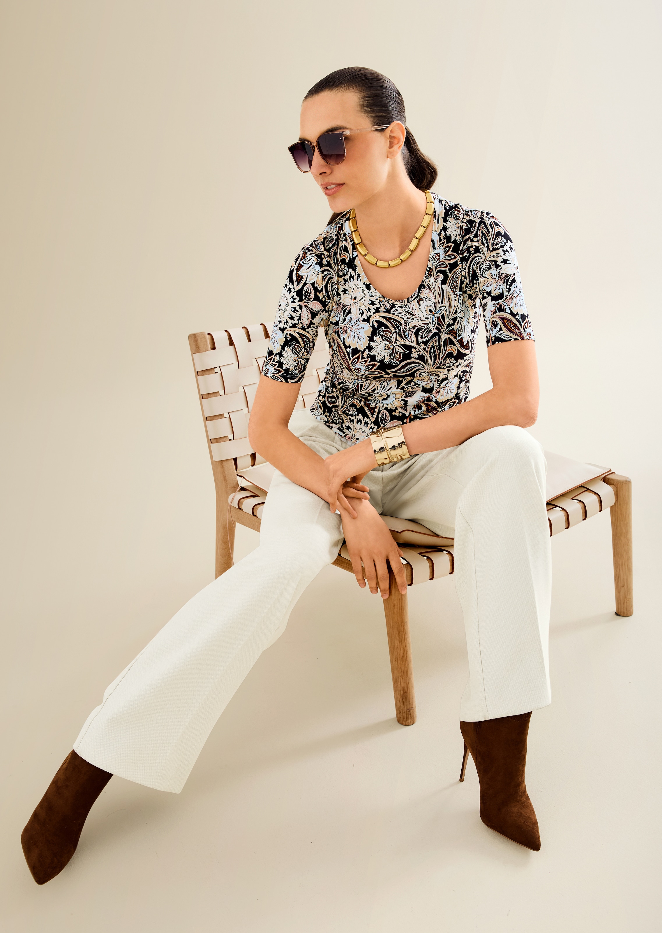Prints bringen Farbe in die grauen Tage und sorgen im Nu für gute Laune – nicht nur im Winter. Der Aufsehen erregende Muster-Mix aus Paisley- und Floral-Elementen macht den Unikat-Druck dieses Shirts so außergewöhnlich und Ihren Style zum echten Hingucker. Ein hautschmeichelnder Look aus weich fließendem Viskose-Stretch, der mit super angenehmem Tragekomfort begeistert und für einen rundum gelungenen Auftritt sorgt. Rundhals-Ausschnitt und kurze Ärmel runden den Style in klassischer Manier ab.