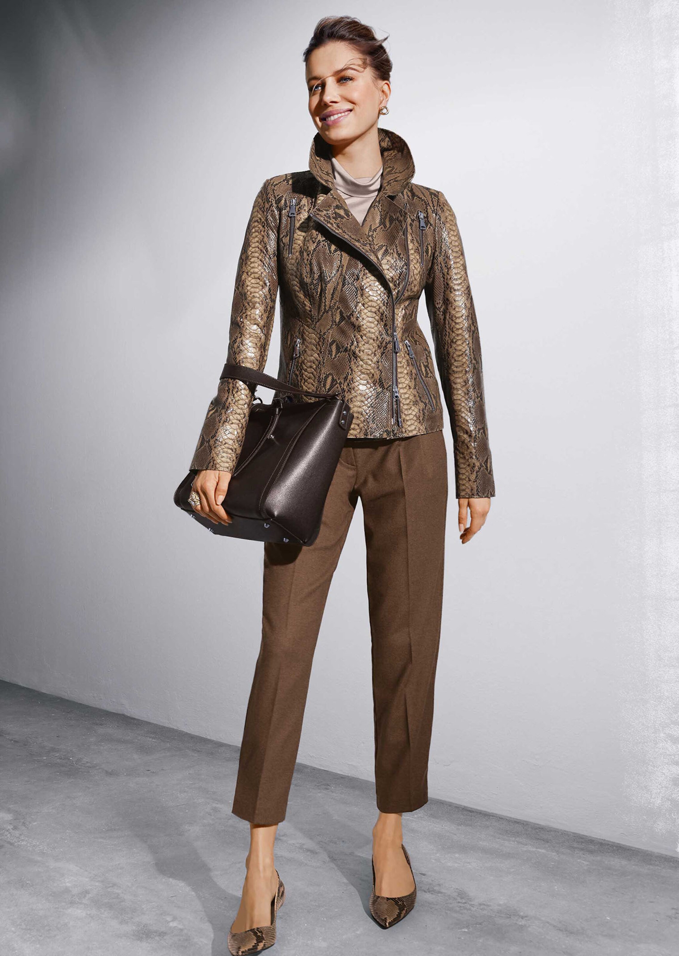 Ein Hosen-Style von gepflegter Modernität, der mit edlem Griff und aufwendiger Detailverarbeitung begeistert. Die Garnmischung ist dank Stretch-Anteil besonders bequem und macht jede Bewegung mit. Vorderseitige Bundfalten und beidseitige Bügelfalten verleihen dem Look eine gepflegte Note und machen ihn zum perfekten Partner anspruchsvoller Kombi-Varianten. Blickfang der schlanken Zigarettenform ist die Saumpartie! Sie wird von Knopfriegeln in Szene gesetzt und bringt modischen Schwung ins Spiel. Der Formbund mit Gürtelschlaufen sitzt bequem auf der Hüfte. Er sorgt für eine ideale Passform und ist auf zwei Haken zu schließen. Ein Knopf an der Innenseite gibt zusätzlichen Halt. Schräg eingearbeitete Schubtaschen stellen ausreichend Stauraum zur Verfügung, während rückseitige Zierleisten Gesäßtaschen imitieren. Die Verarbeitung in Kurzgrößen wird auch den Ansprüchen etwas kleinerer Frauen gerecht.