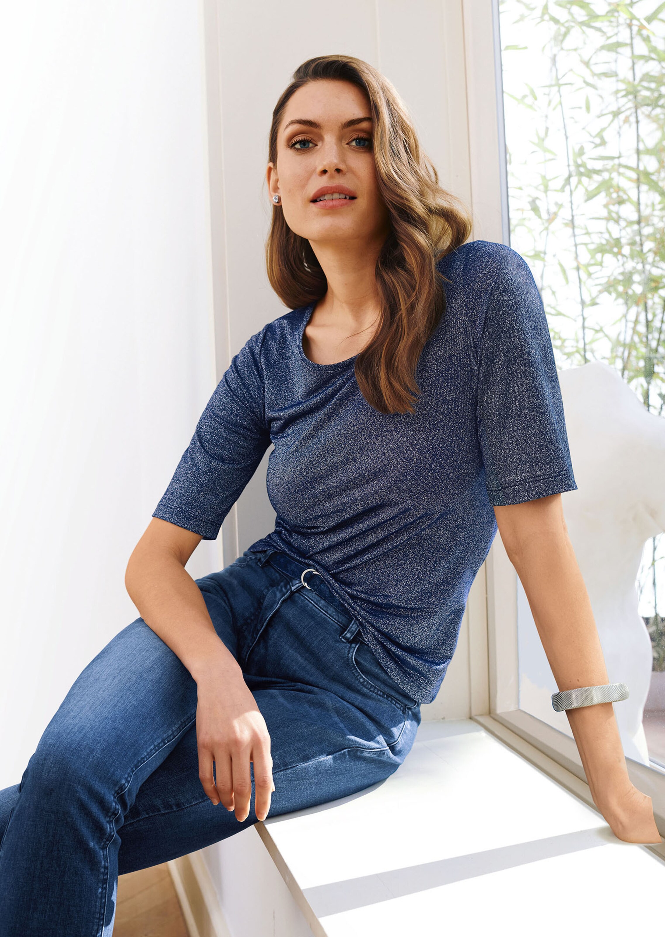 Eine typische Lieblingsjeans! Die enge Jeans mit schmalem Jeansgürtel und Doppel-D-Ringschnalle hat einen schönen, knackigen Sitz und eine gute Passform. Die rückseitige, v-förmige Passe sorgt für einen raffinierten Push-up-Effekt am Po. Die knöchellange Slimline-Form zeichnet eine fantastisch schmale Beinlinie. Wascheffekte setzen den lässigen Akzent. Ausgestattet ist sie mit Formbund und Gürtelschlaufen. Die angenehme Stretchqualität macht jede Bewegung mit. Dank zusätzlicher Kurzgrößen können sie auch kleine Frauen prima tragen.