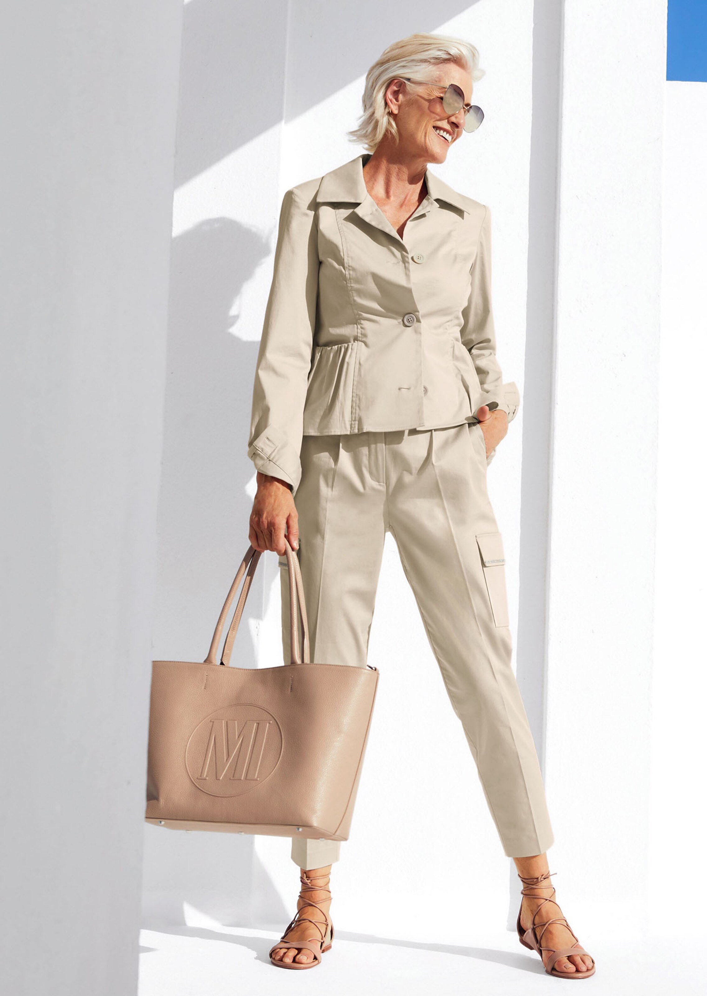 Kurze Blazer-Formen bringen Schwung in die Kombination und setzen trendstarke Akzente. Tascheneingriffe an der Oberkante des Schößchens sorgen für ein Plus an Raffinesse und machen den Schößchen-Blazer zum echten Lieblingsstück. Schlank und leicht tailliert sorgt der Stretch für hohen Trage-Komfort und ist mit breitem Hemdkragen und langen Manschettenärmeln gearbeitet.