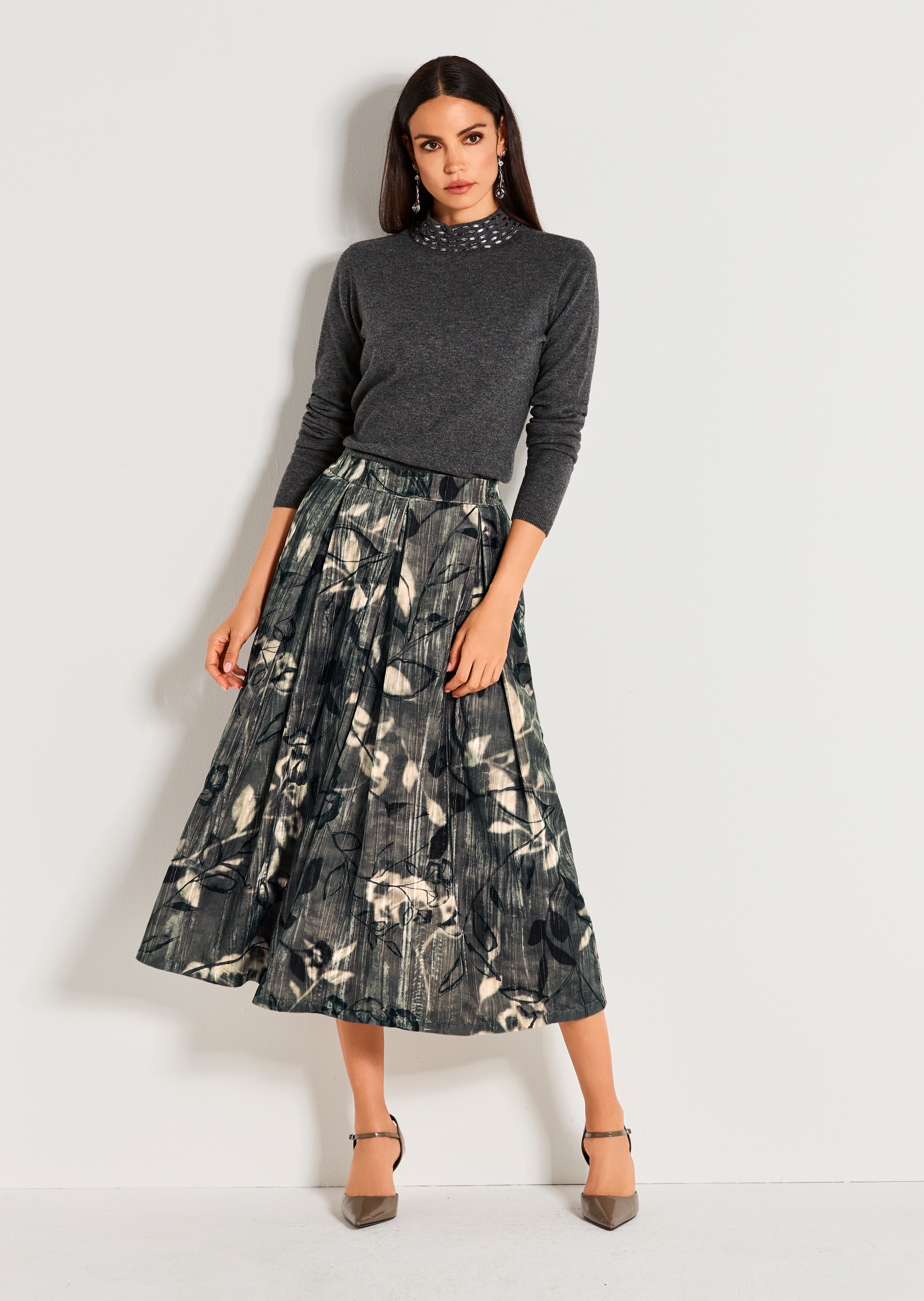Ein Rock wie ein sanfter Tanz. Diesem femininen Midi-Rock gelingt die perfekte Balance zwischen Ausdruck und Anmut. Zart schimmernder Samt mit charaktervoller Crinkle-Struktur erhält durch den floralen All-over-Print seine zauberhafte Leichtigkeit und einen Hauch Poesie. Die lebendige Oberfläche lässt das Licht raffiniert spielen und verleiht jedem Auftritt subtile Tiefe. Kellerfalten formen ab dem Bund eine schwungvolle Linie und sorgen für eine festlich ausschwingende Weite, die bei jeder Bewegung ihre Wirkung entfaltet. Der Bund ist angenehm elastisch und daher bequem zum Schlüpfen. Er passt sich sanft der Hüfte an und ist ideal für lange Abende oder Anlässe, bei denen stilvoller Komfort gefragt ist. Nahtfein integrierte Taschen schenken auf diskrete Weise Platz für Essentielles, ohne den fließenden Gesamteindruck zu stören.