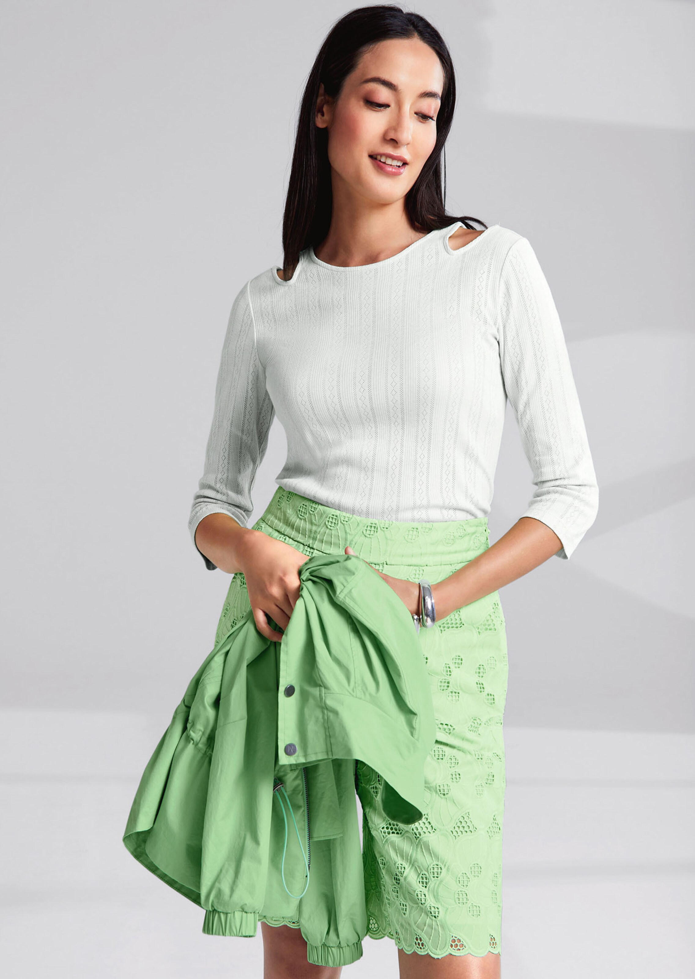 Modische Cut-outs und feines Pointelle-Muster verleihen dem Shirt It-Piece-Charakter und runden jeden Look mit trendstarker Note ab. Die feine Baumwoll-Qualität ist angenehm kühl auf der Haut und präsentiert sich hier in modisch kurzer, leicht taillierter Form. Das Rundhals-Shirt kann vielseitig kombiniert werden und ist mit attraktiven 3/4-Ärmeln gearbeitet.
