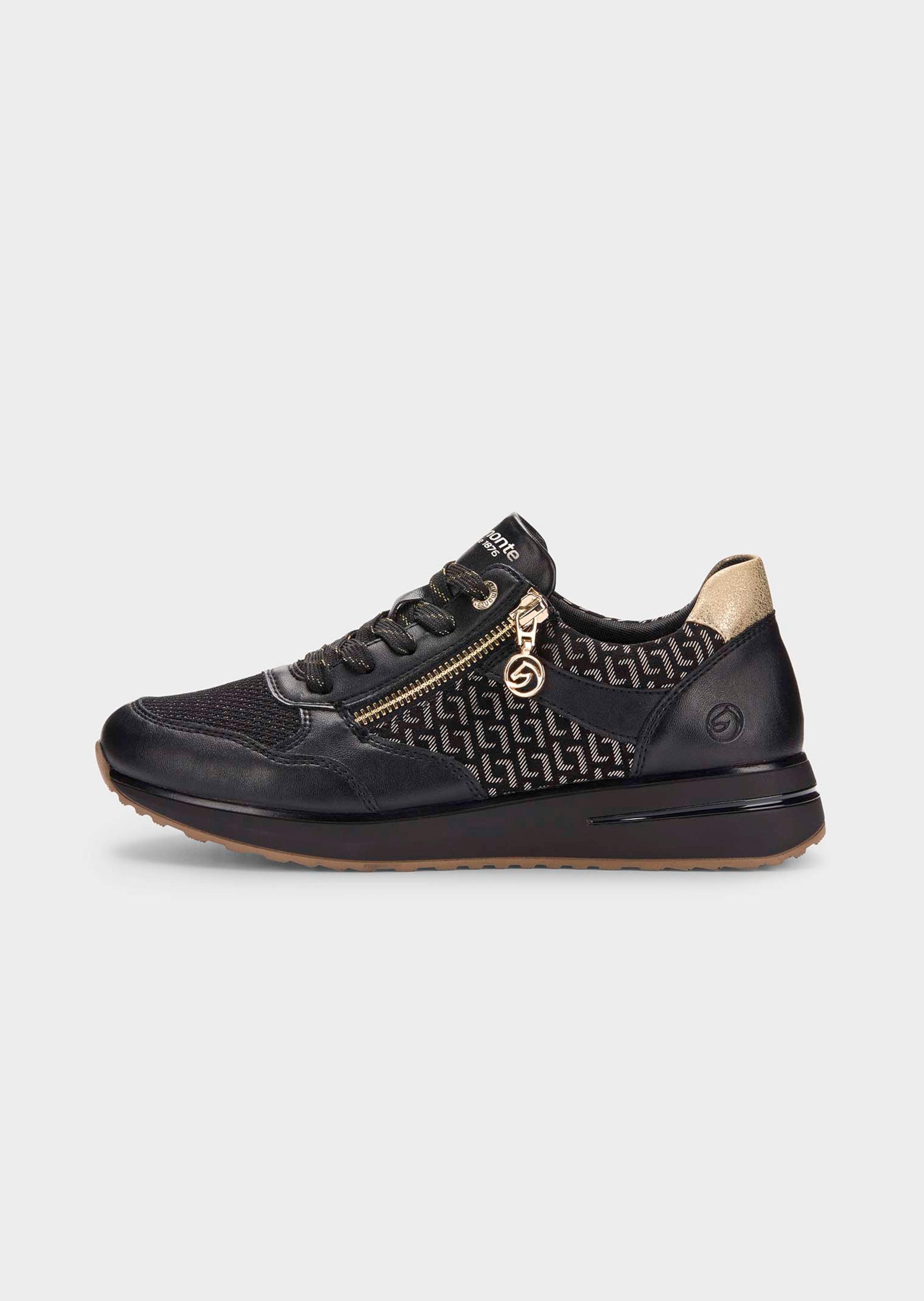 Ein Sneaker mit Glam-Appeal für den Tag – von REMONTE! Goldfarbene Details, glänzende Ösen und ein dekorativer Reißverschluss machen ihn im Alltag zum echten Blickfang. Der Materialmix aus Textil und Synthetik sorgt für Spannung, das gepolsterte Wechselfußbett und die superleichte PU-Laufsohle für maximalen Tragekomfort. Die Kombination aus Schnürung und Reißverschluss erleichtert das Anziehen. Ein besonderer Sneaker, der Glamour und Trendgespür charmant vereint.