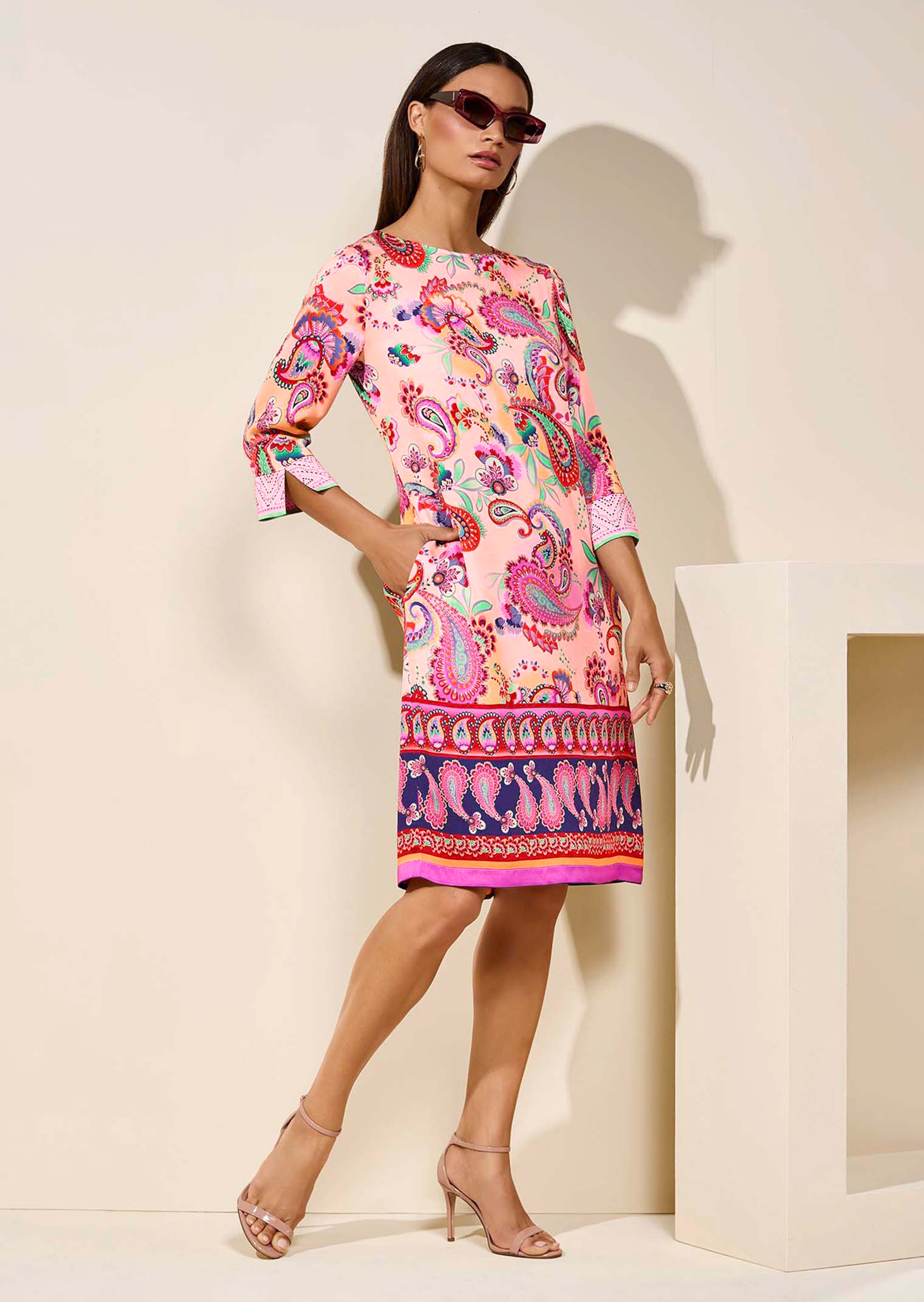 Dieses luftige Sommerkleid im farbenfrohen Paisleydessin ist die perfekte Wahl für warme Tage und entspannte Freizeitmomente. Gefertigt aus leicht glänzendem Viskose-Satin, bietet es ein angenehm weiches Tragegefühl und eine fließende Silhouette. Der lockere Schnitt in modischer H-Linie schmeichelt der Figur und sorgt für hohen Tragekomfort. Der Rundhalsausschnitt und die 3/4-Ärmel mit dezenten Schlitzen unterstreichen den lässigen Charakter des Kleides. Praktische Nahttaschen bieten zusätzlichen Komfort, während das einzigartige Muster jedes Kleid zu einem Unikat macht. Knieumspielend und pflegeleicht, ist dieses Kleid ideal für sommerliche Ausflüge und entspannte Tage.