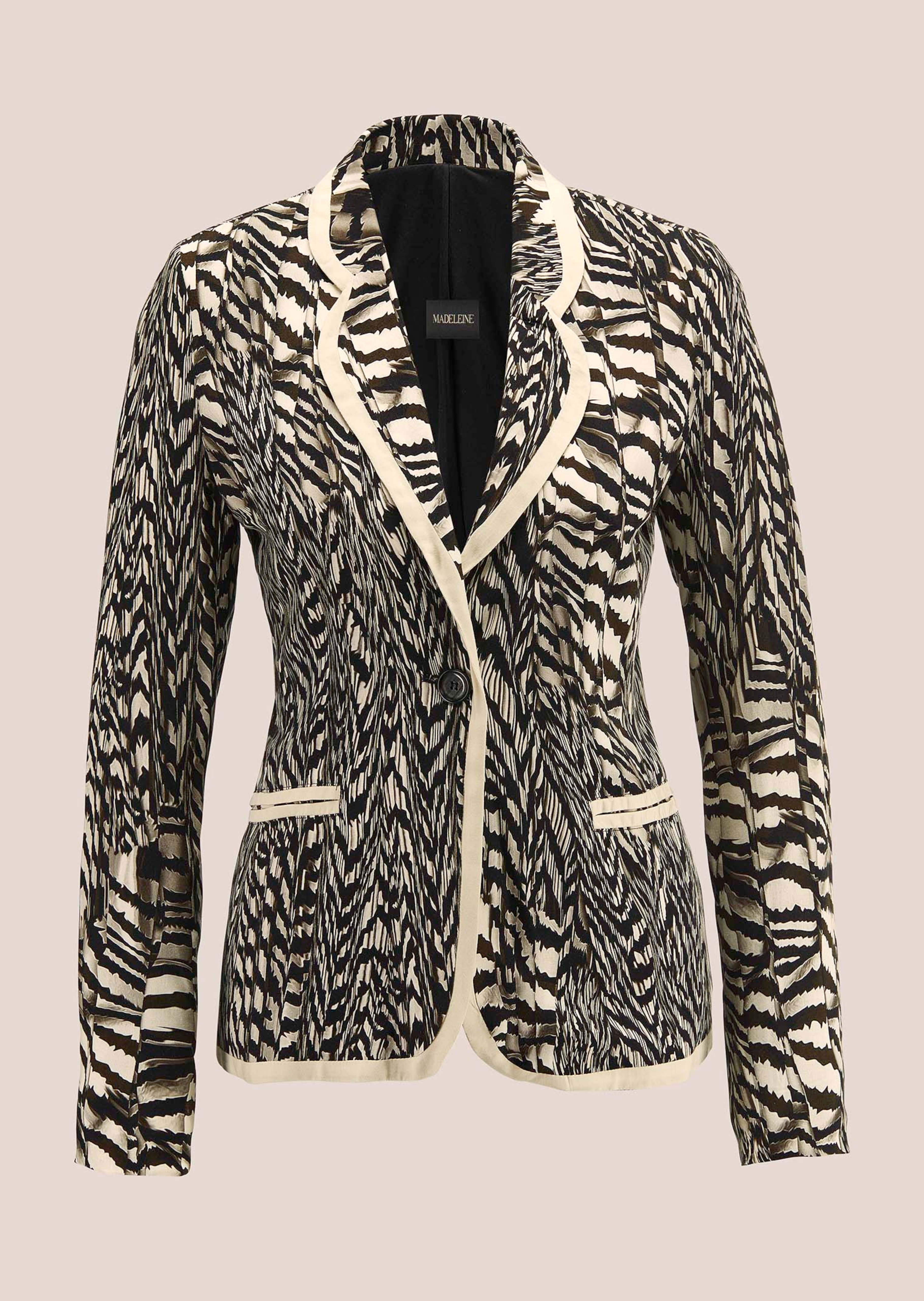Der sportive Blazer mit schwarz-weißem Animalprint setzt ein markantes Fashion-Statement. Die kurze, leicht taillierte Form und der geschwungene Reverskragen verleihen dem Blazer eine moderne Silhouette. Die paspelierten Taschen und Kanten unterstreichen die sorgfältige Verarbeitung. Sommerlich und leicht lässt sich der Blazer vielseitig kombinieren. Er ist der ideale Begleiter für verschiedene Anlässe und verleiht Ihrem Outfit eine lässige Note. Tragen Sie den Blazer elegant zu Bluse und Hose oder lässig zu einem T-Shirt und Jeans.