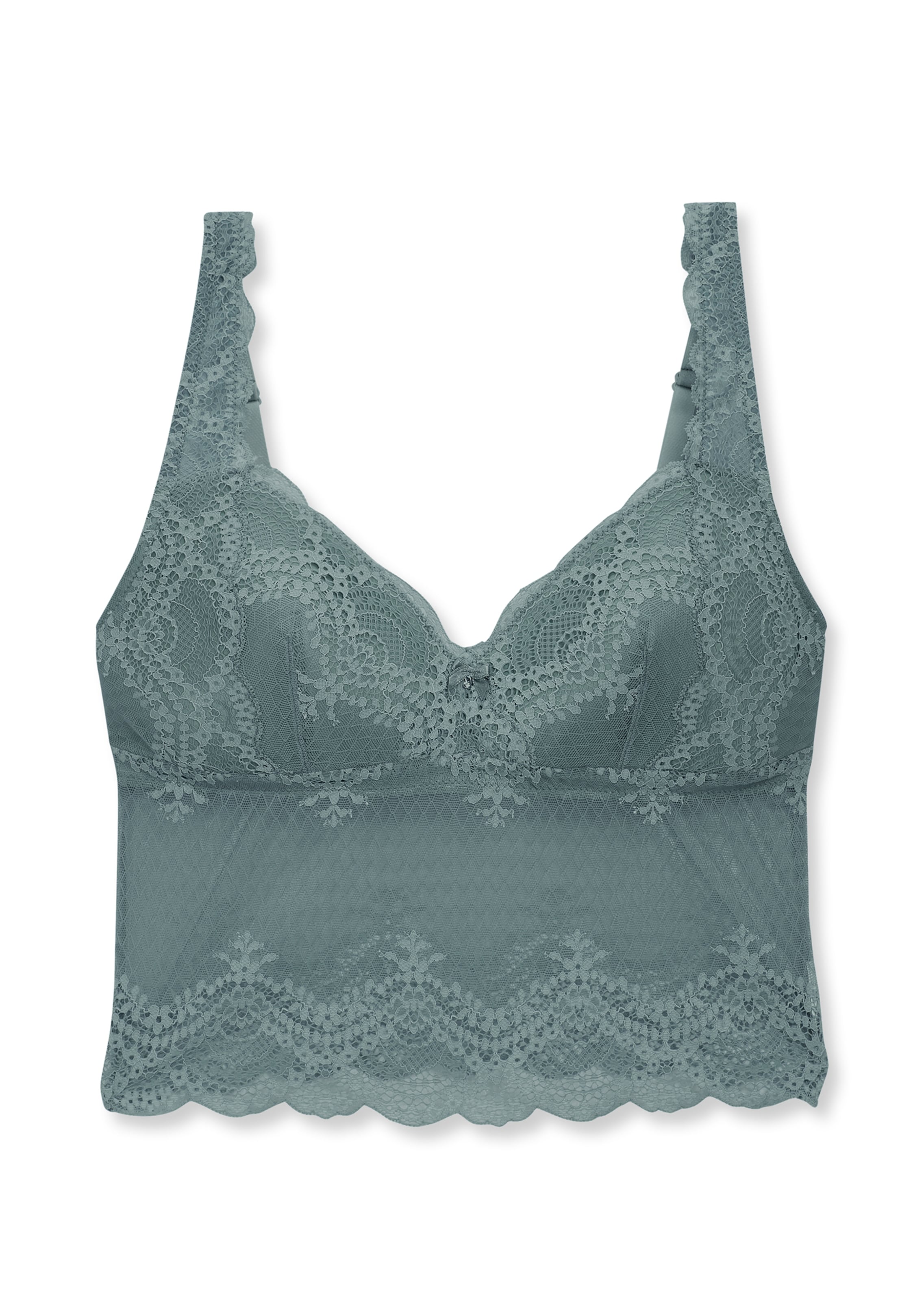 Ein verführerisch schönes Bustier, das auch unter Blazer oder Bluse blitzen darf. Komplett gefertigt aus zarter Spitze ist es kaum spürbar und doch stützend. Dafür sorgen Softcups, Seitenstäbchen, ein Unterbrustgummi rundum und verstellbare Spitzenträger. Die kleine Zierschleife mit Strassstein am Mittelsteg ist schmückendes Extra.