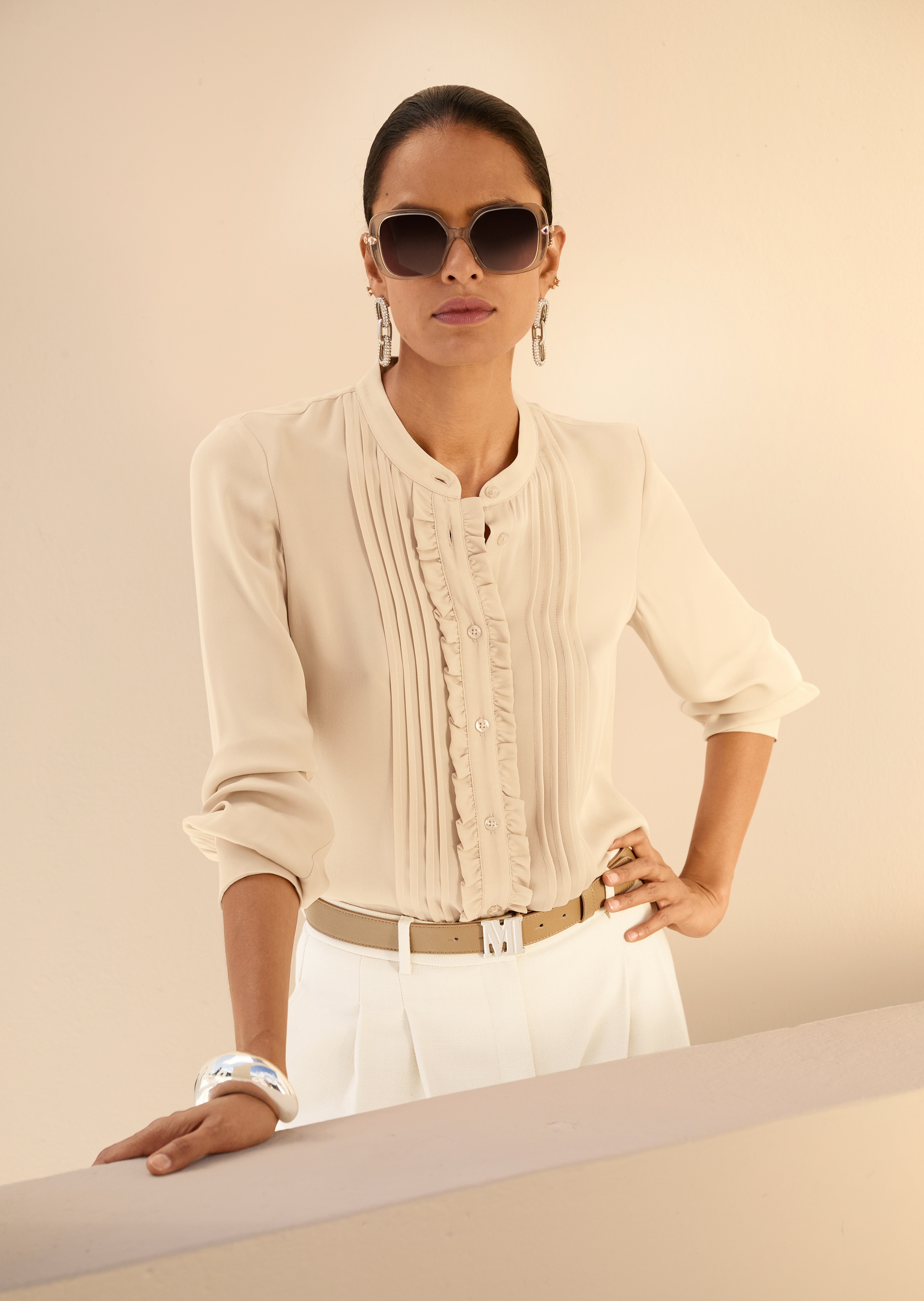 Ein Hauch Romantik hat noch nie geschadet und bringt Abwechslung in jeden Look. Der vielseitig kombinierbare Blusen-Style begeistert durch sein weich fließendes Naturgarn mit edlem Griff und schmeichelndem Trage-Komfort. Die von Biesen und Rüschen eingerahmte Knopfleiste bringt festlichen Glanz ins Spiel und sorgt für Auftritte mit Wow-Effekt. Ein kleiner Stehkragen und lange Ärmel, die an den Knopfmanschetten liebevoll in Falten gelegt sind, runden den Look perfekt ab.