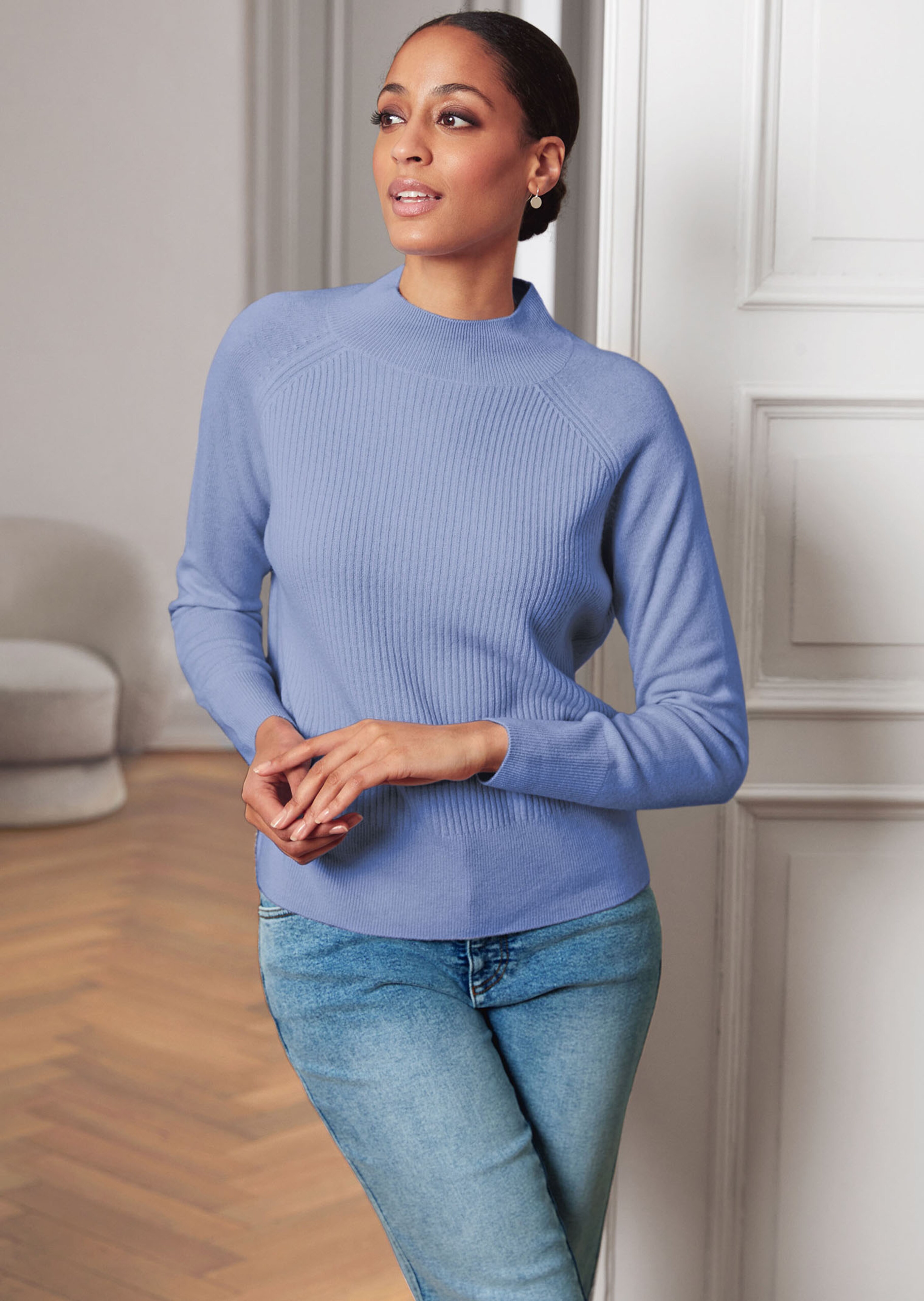 Der Mix aus Glattstrick & Rippe schenkt dem Pullover ein Plus an Modernität und bringt Abwechslung ins Spiel. Ein zauberhafter Basic-Style, der durch seinen Kaschmir-Anteil mit super softem Trage-Gefühl begeistert und beliebig kombiniert werden kann. Modisch kurz und in großzügiger Oversize-Form präsentiert sich der Maschen-Partner mit Stehkragen und langen Raglanärmeln.