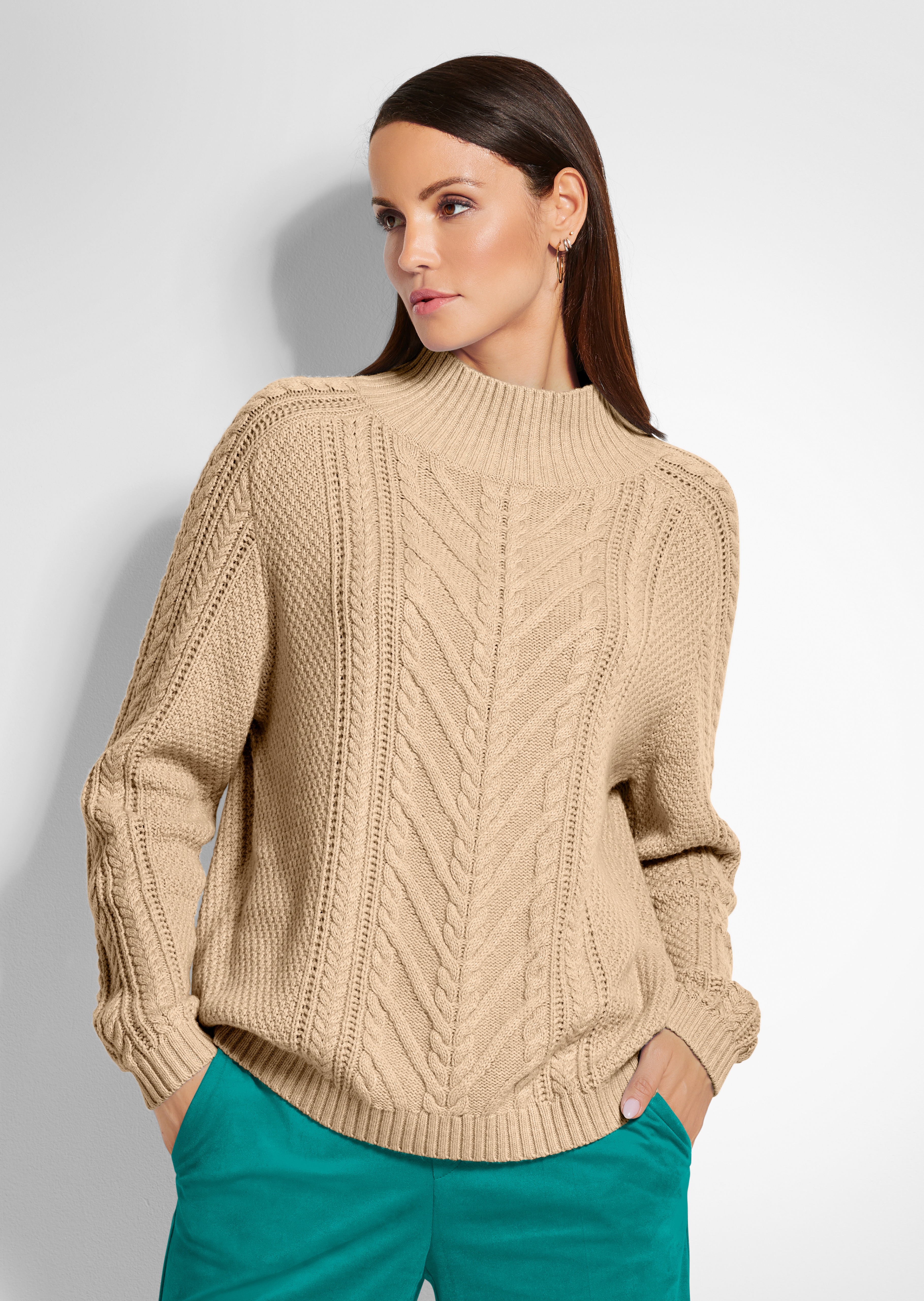 Lassen Sie Strukturen wirken und verleihen Ihrem Look eine wunderbar folkloristische Note – damit liegen Sie absolut im Trend. Die weiche Garnmischung begeistert durch ihren Mix aus Reiskorn-Strick und Zopfmuster mit zauberhaft modischem Charme und macht Ihren Look zum echten Maschen-Highlight. Die legere Linie mit Stehkragen und langen Ärmeln ist bequem im Trage-Gefühl und kann vielseitig kombiniert werden.