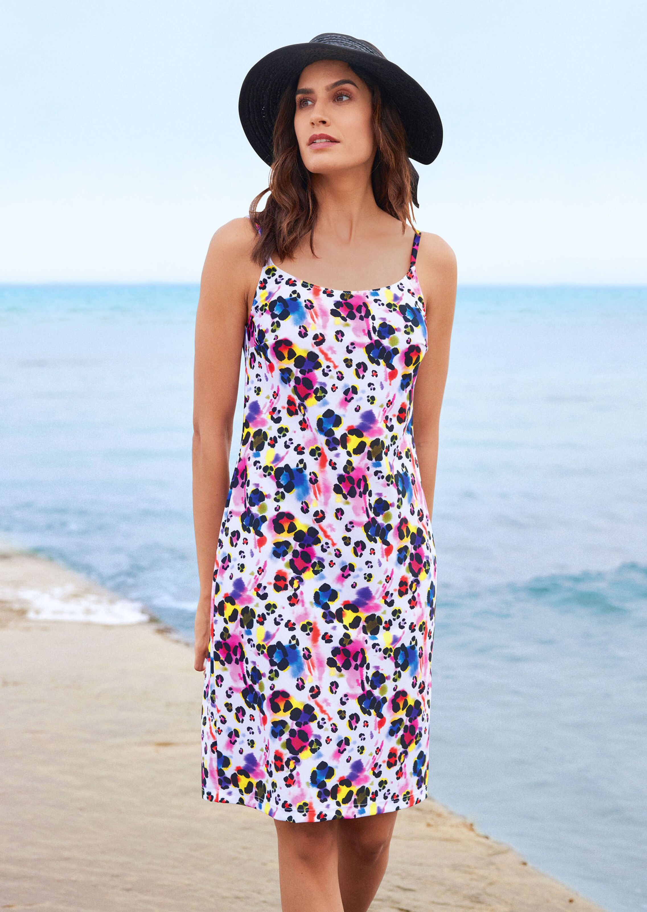 Es gibt nichts Schöneres als einen Flirt mit der Sonne. In diesem Strandkleid mit farbenfrohem Unikatprint kann man noch dazu die bewundernden Blicke genießen. Ein femininer und dennoch unkomplizierter Look, der durch die Stretchqualität bequem und koffertauglich ist. Mit schmalen Trägern und Brustabnähern für eine gute Passform.