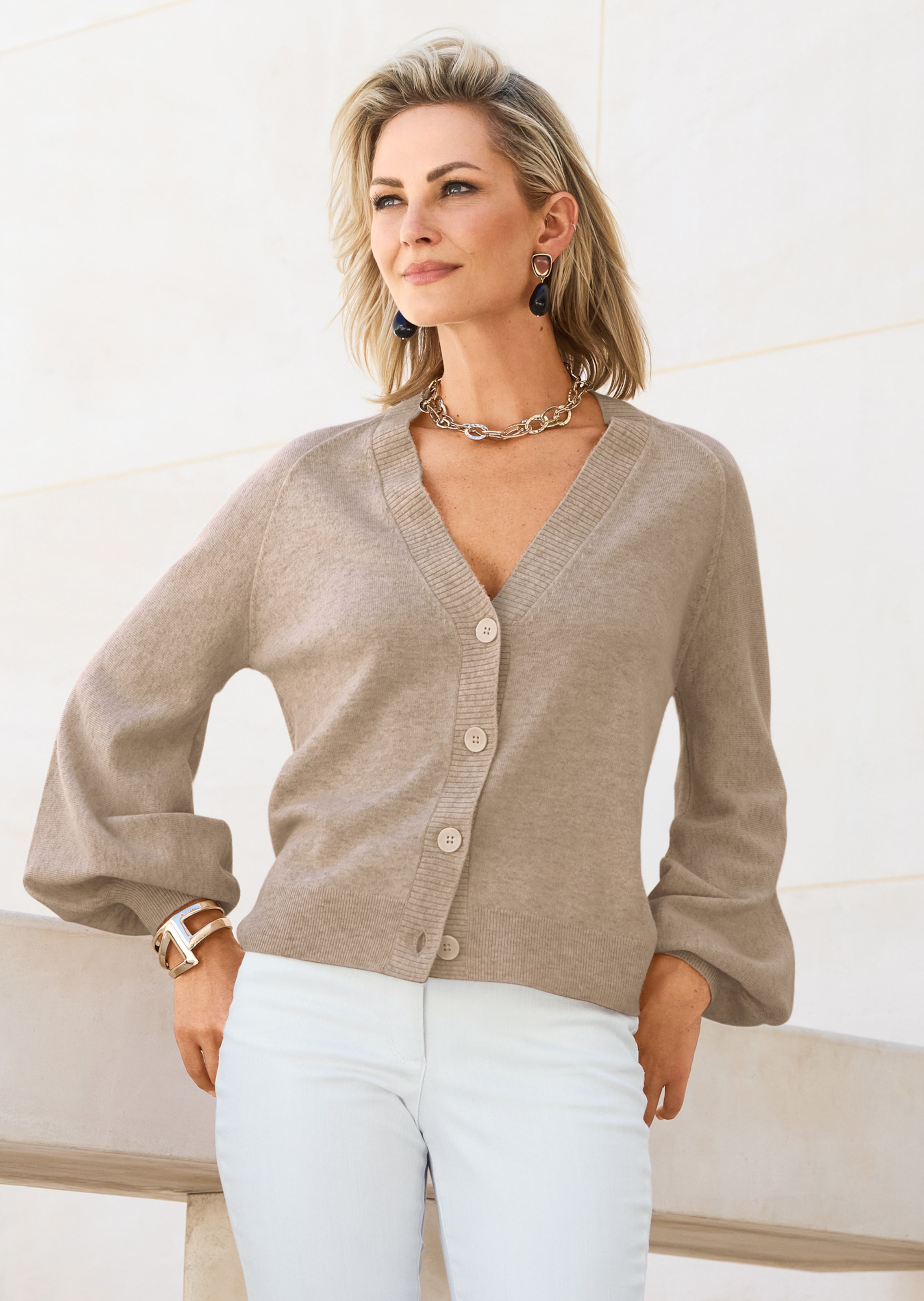Ein zauberhaft schöner Maschen-Style, dessen flauschiger Garnmix durch den Good-Cashmere-Anteil besonders kostbar wird und puren Trage-Luxus verspricht. Die trendstarke Kurzform der Strickjacke wird von modischen Ballonärmeln sehenswert aufgepeppt und ist mit tiefem V-Ausschnitt und durchgängiger Knopfleiste gearbeitet. Ein angenehm weicher Styling-Partner, der das Zeug zum Lieblingsstück hat.