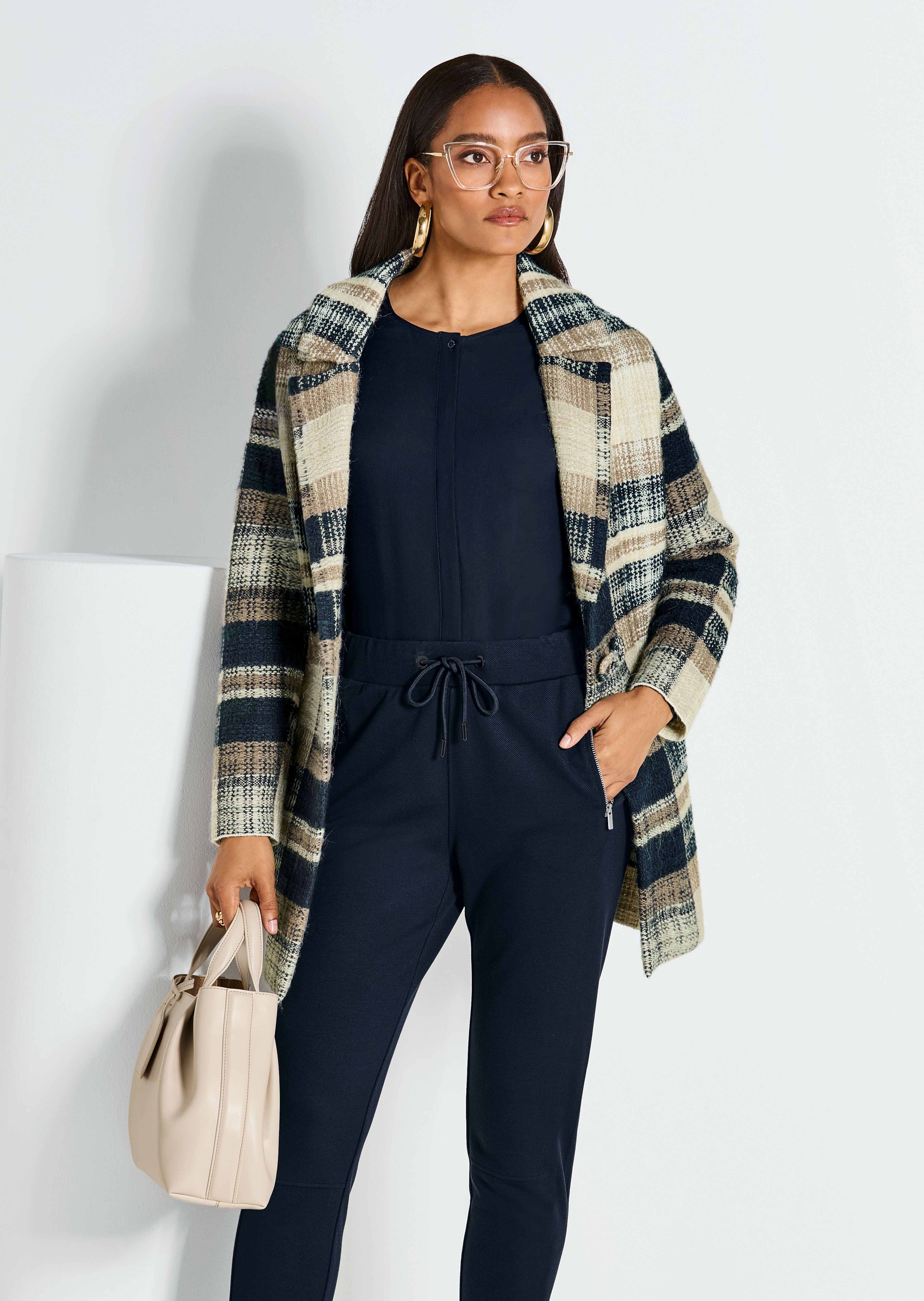 Ein modisch legerer Maschen-Look, der Schwung in Ihren Auftritt bringt und angenehm zu tragen ist. Hochwertige, italienische Garne verzaubern mit einem Karo in wunderschönem Farbdreiklang und machen durch das individuell variierende Muster jedes Stück zum Unikat. Die lässig gerade Long-Form der Strickjacke ist mit klassischem Reverskragen und zweireihigem Knopfverschluss gearbeitet. Besonders edel: die Knöpfe sind mit Strickgarn bezogen und unterstreichen die liebevolle Detailarbeit.