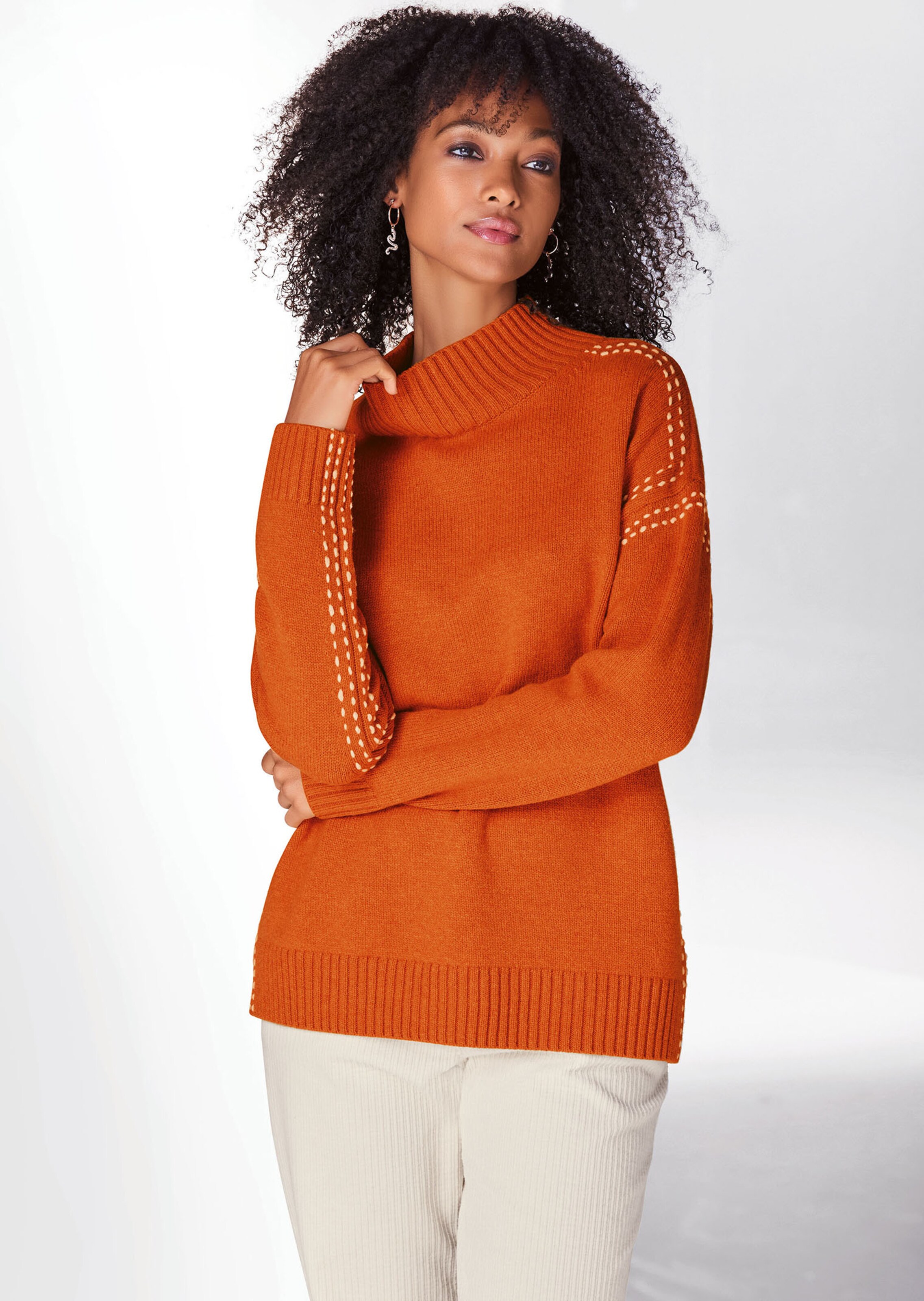 Kuschelig warme Winterpullover machen diese Saison mit besonderen Details auf sich aufmerksam. Der Strickpullover mit Stehkragen wirkt durch den markanten Kontraststepp so trendy. Der dicke Schurwoll-Formstrick mit etwas Kaschmir trägt sich angenehm warm. Wir haben ihn für einen lässigen Look mit überschnittener Schulter, Rippenabschlüssen und Langarm gestaltet. Kombinieren Sie ihn zu weichem Weiß für einen frischen Trendlook der Saison.