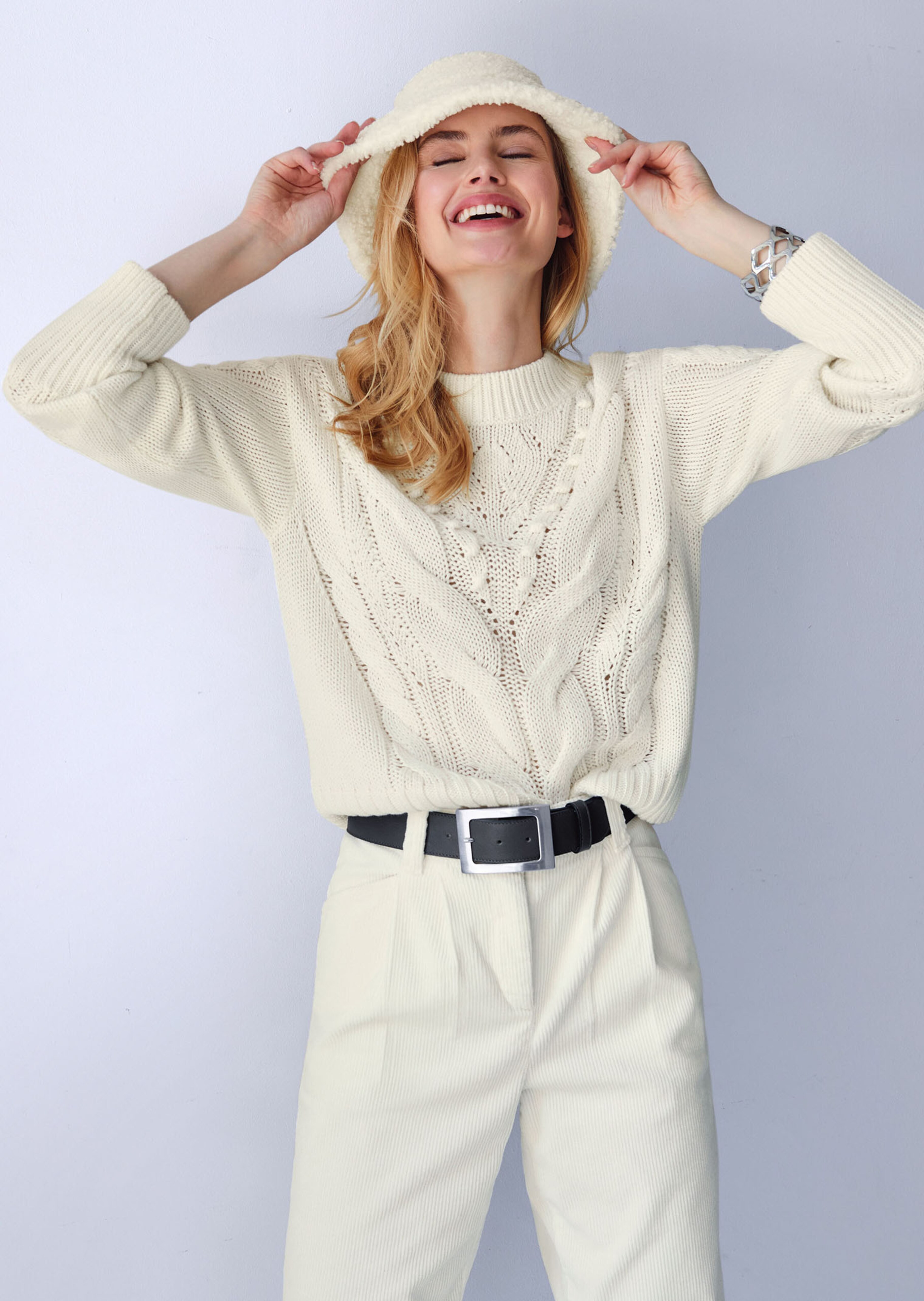 Ein starker Effekt: Der Strickpullover mit Zopfmuster zeigt den raffiniert platzierten Musterstrick in überdimensionaler Variante. Der lässige Style ist mit Rundhalsausschnitt, Langarm, überschnittenen Schultern und Rippenabschlüssen gestaltet. Der wertvolle Strick im Baumwoll-Merino-Mix trägt sich angenehm wärmend.