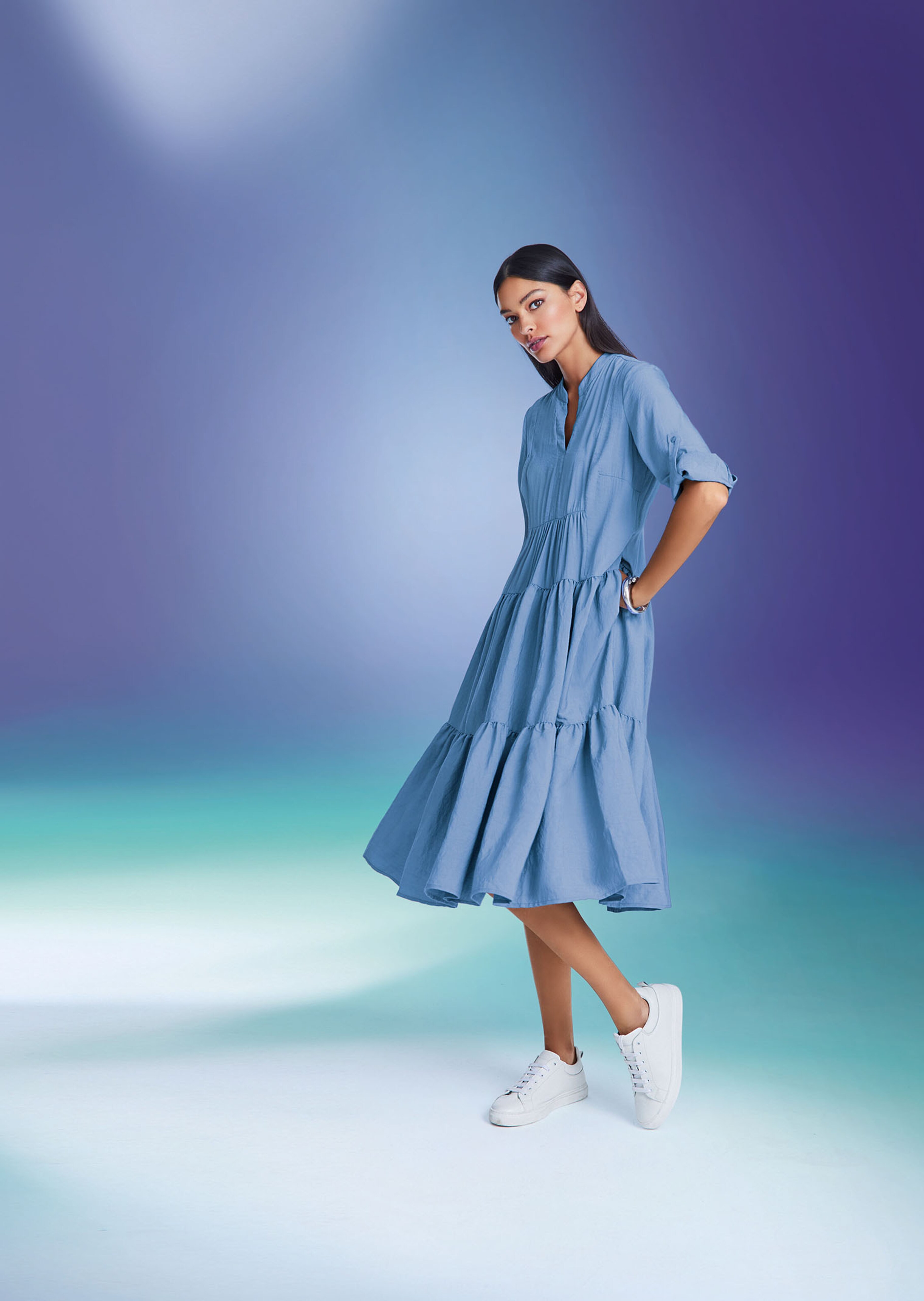 Das Stufenkleid ist zurück! Hier in lässiger H-Linie mit schwingendem Rock und praktischen Taschen. Sein hochwertiger Viskose-Mix trägt sich herrlich angenehm und kühl. Logo-Knöpfe setzen an den Krempelärmeln den dezenten Akzent. Egal, zu welchem Anlass: das schwingende Kleid lässt Sie im Handumdrehen top gestylt sein.