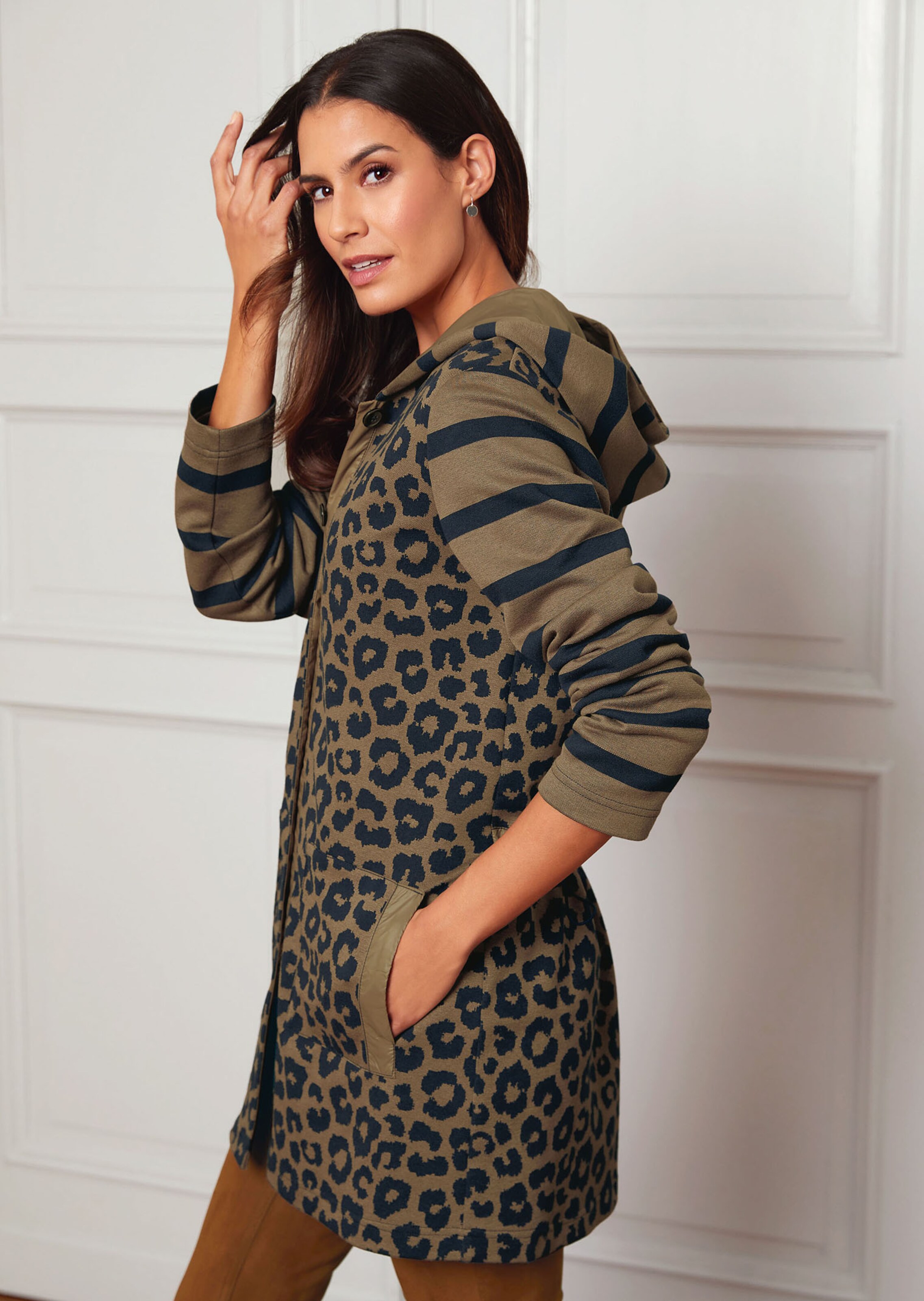 Raffinierter Muster-Mix und hoher Trage-Komfort machen die Sweat-Jacke zum Lieblingsstück. Die bequeme Langarm-Jacke ist mit Knöpfen in Horn-Optik, zwei Taschen und einer praktischen Kapuze gearbeitet. Sie schützt bei unangenehmem Wetter und verleiht dem Look eine lässige Note. Der bügelfreie Stretch ist ideal für die Reise. Ein rückseitiger Kordelzug macht die Taille variabel.