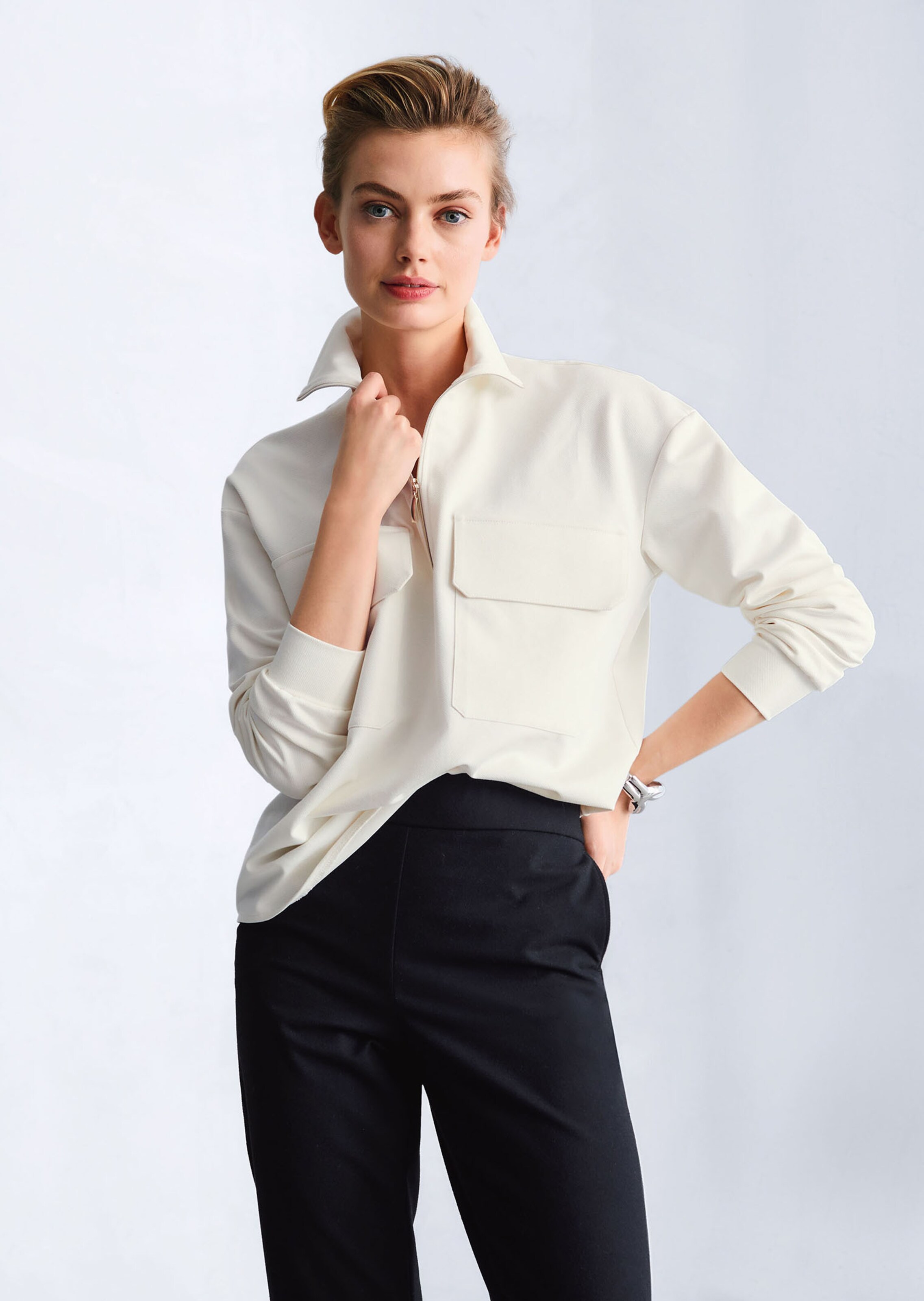 Ein starker Effekt: Das Sweatshirt mit Taschen zeigt diese als Stil-Element in überdimensionaler Pattentaschenform. Ein edler Zipper setzt den zusätzlichen Akzent. Die dezente Oversizedform ist mit Stehkragen, überschnittener Schulter und Langarm mit Manschette gestaltet. Dank der Farbe können Sie es auch elegant zu Schwarz kombinieren.