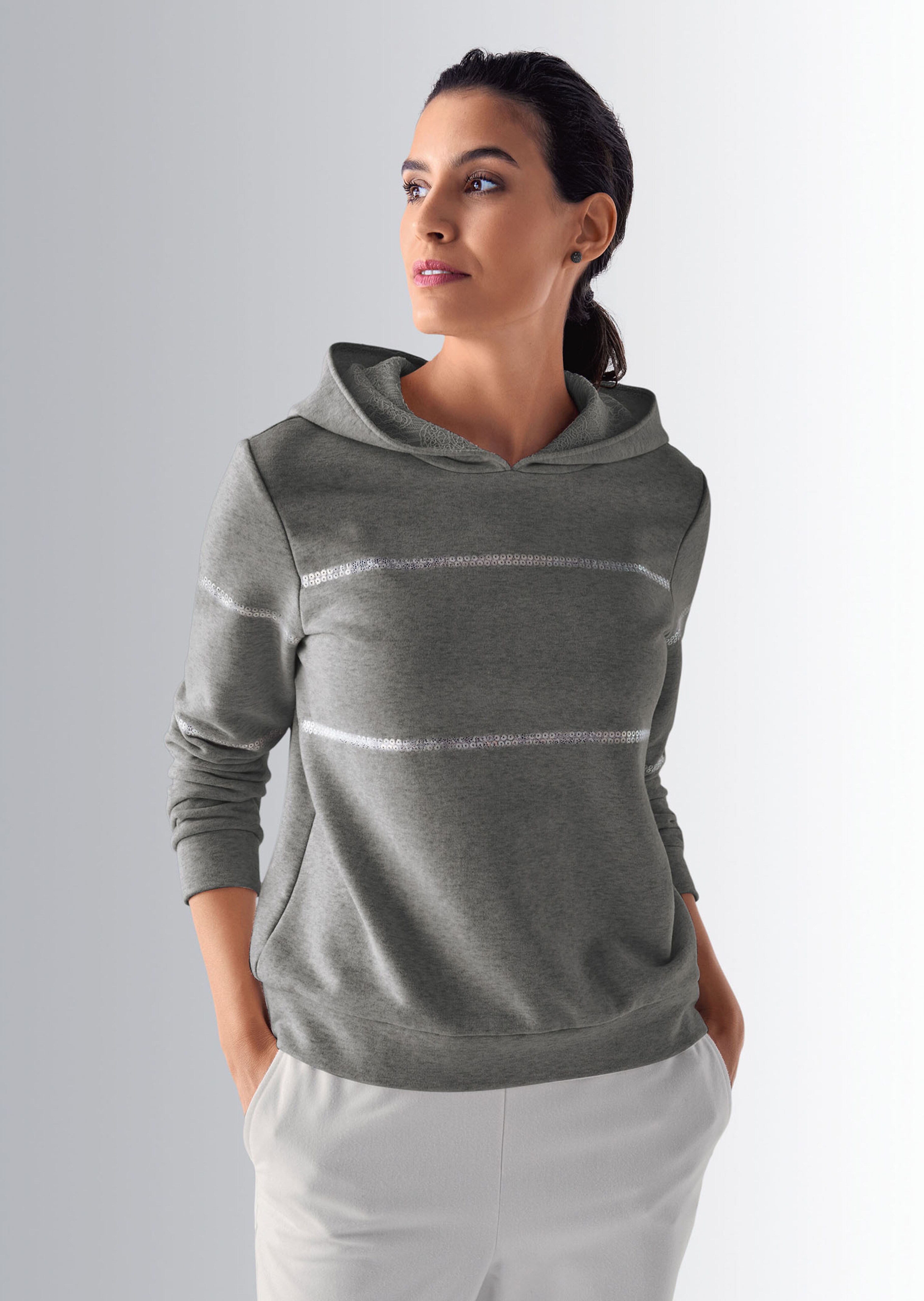 Edel-lässige Oberteile sind ein Top-Thema der Saison. Das Sweatshirt mit Pailletten zeigt den schönen Schmuck im Vorderteil und an den Ärmeln. Die Kapuze ist kostbar mit Spitze belegt. Mit Langarm, Saumbündchen und Ärmelbündchen ist es ein entspannter Partner cooler Stylings. Dank der Farbgebung können Sie es gut kombinieren – tonig oder im Kontrast.