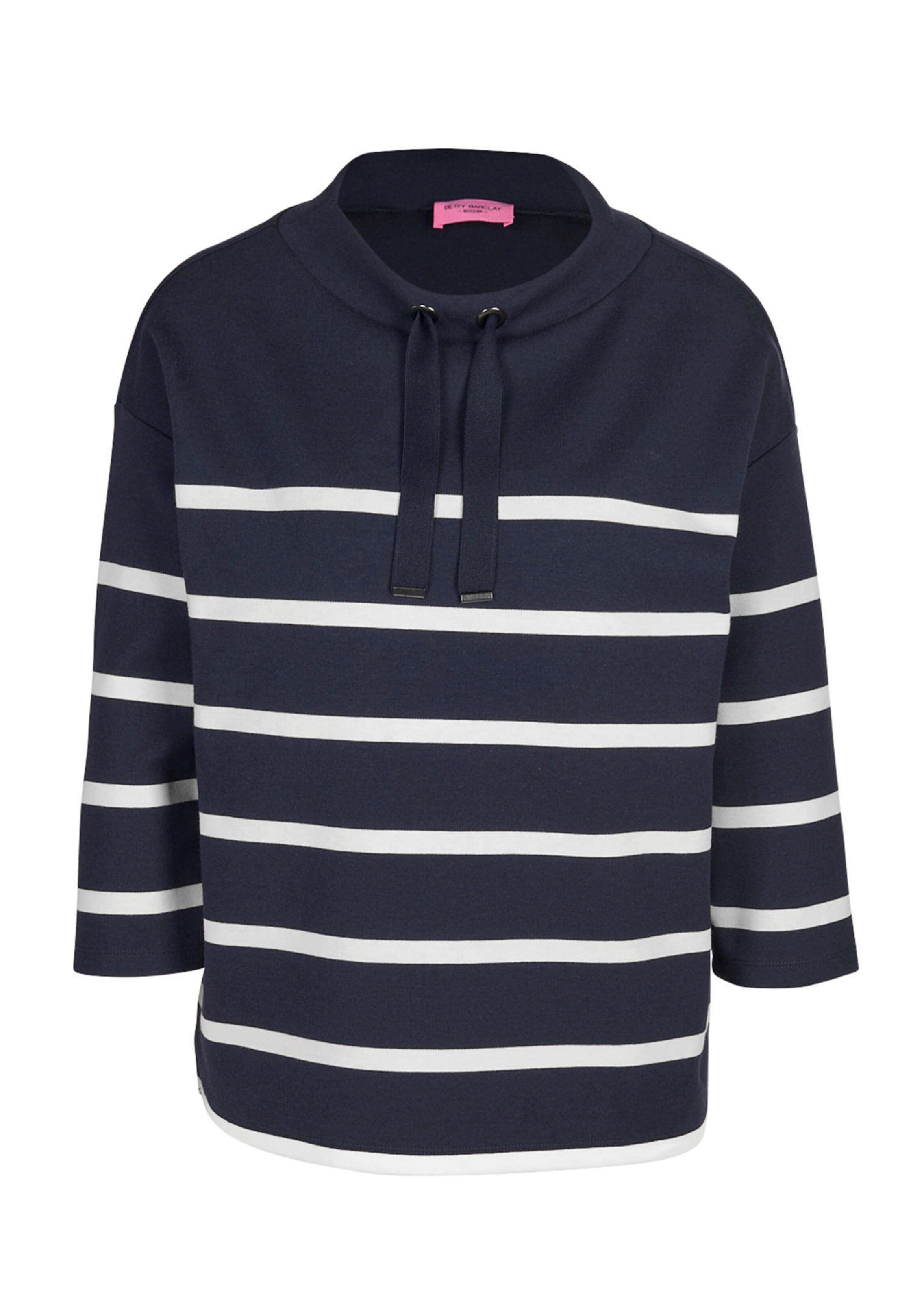 Das Sweatshirt im Marine-Look von BETTY BARCLAY ruft sofort Urlaubsgefühle hervor! Die Streifen sind typisch für den Marine-Style, auch der gerade Schnitt mit Stehkragen und Bindebändern unterstreicht die maritime Optik. Die Schultern sind überschnitten und gehen in lässige 3/4-Ärmel über – ein bequemes Modell für den coolen Freizeitlook. Länge in Gr. 38 ca. 60 cm. Styling-Tipp: Bleiben Sie in der maritimen Farbwelt und kombinieren Sie klassische Stoffhosen und Segelschuhe dazu. Dann kann der nächste Bootstrip kommen!