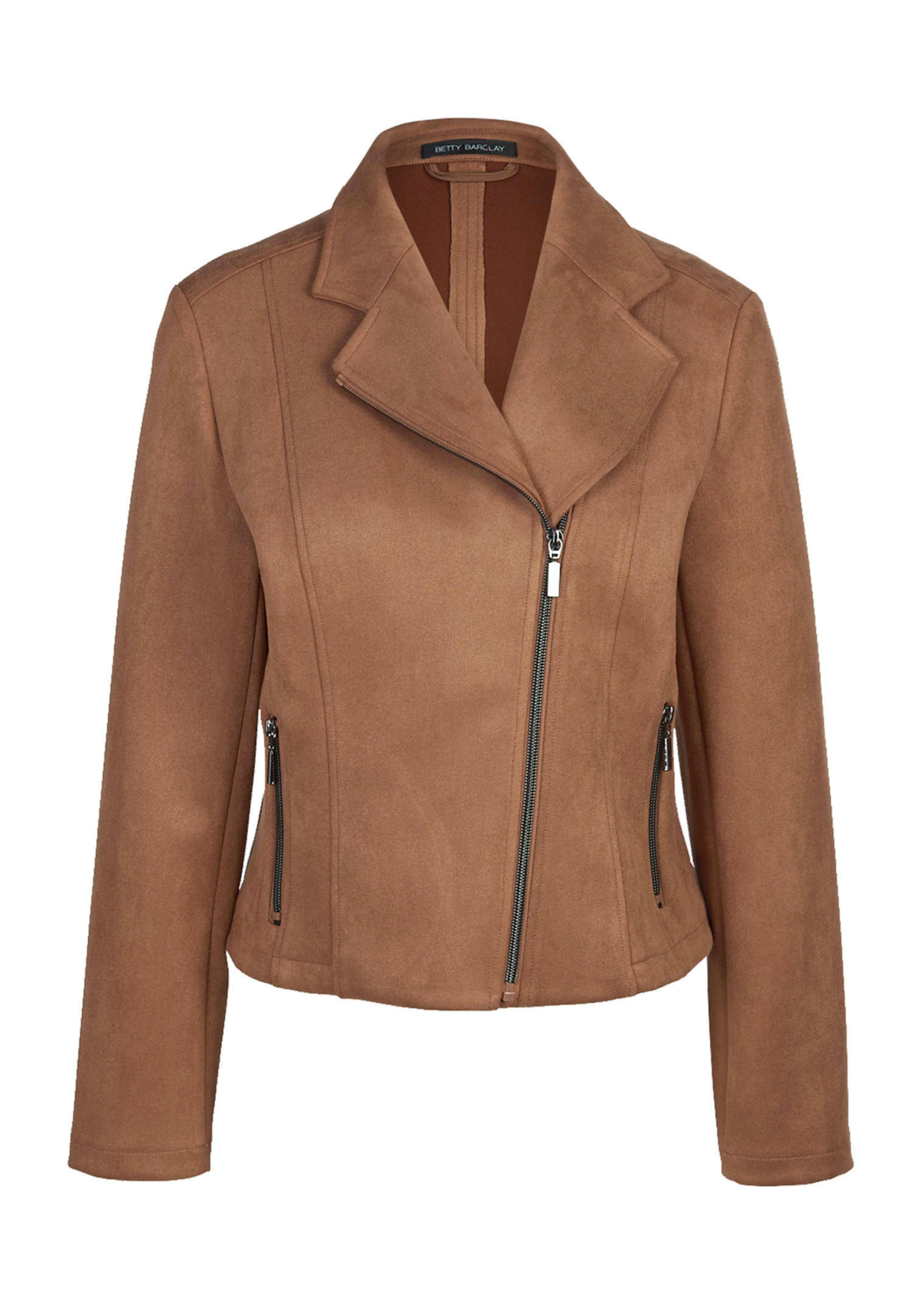 Jacke im coolen Bikerstil von BETTY BARCLAY. Das edle, weiche Velourslederimitat sorgt für einen bequemen Sitz, die figurnahe Passform betont Ihre feminine Silhouette. Mit typischen Biker-Elementen: Der modische Reverskragen, die Passe im Rückteil und die Reißverschlüsse machen den Look! Länge in Gr. 38 ca. 54 cm. Styling-Tipp: In Velours-Optik bekommt die verkürzte Bikerjacke einen edlen Touch – unterstreichen Sie dies mit hochwertigen Kombipartnern wie einer eleganten schmalen Hose und einem seidigen Top!