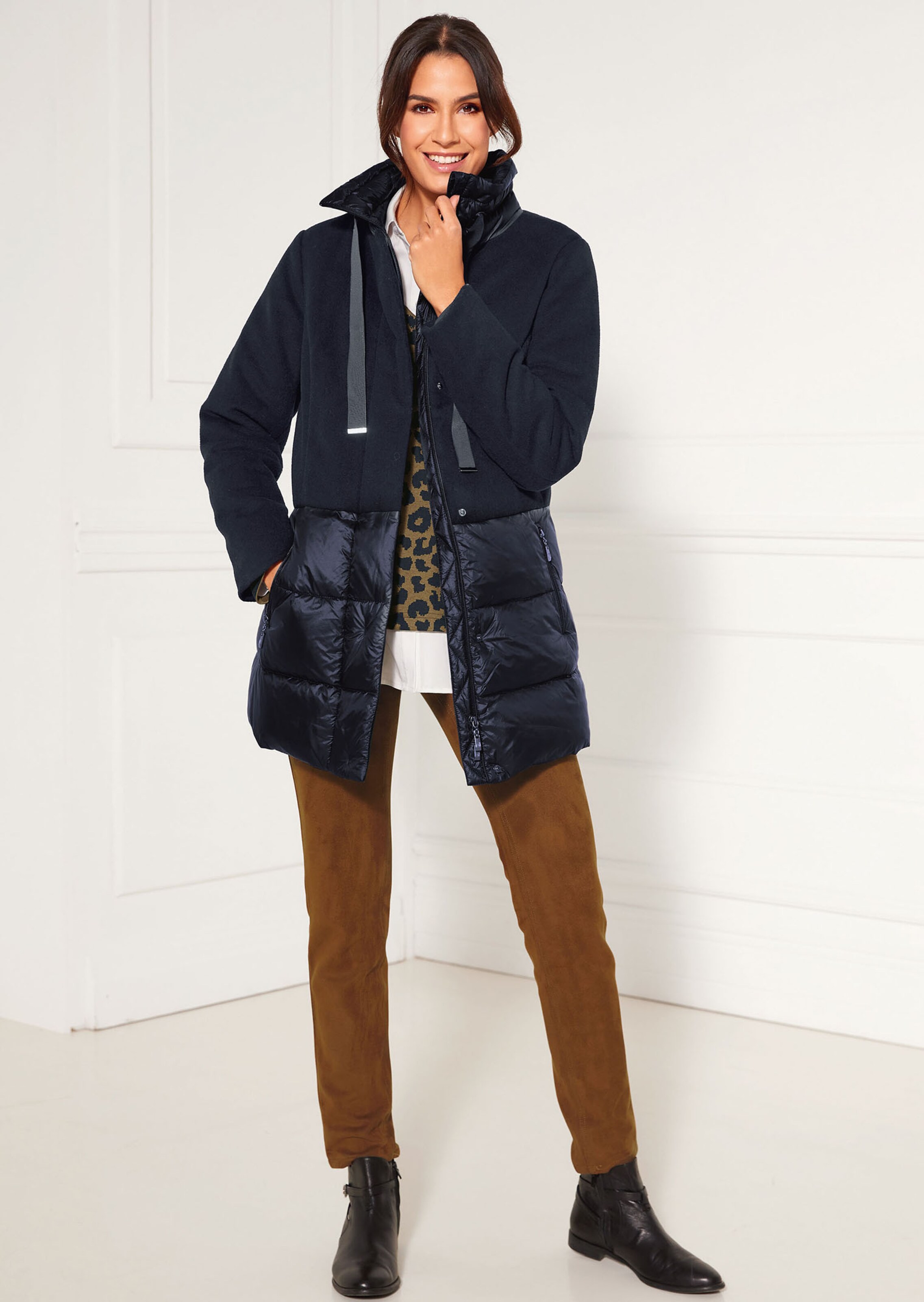 Der Material-Mix aus Wolle und Nylon bringt Schwung ins Outfit und zieht modeverliebte Blicke an. Die bequeme H-Form der Jacke ist mit wertvoller Daunen/Feder-Füllung ausgestattet. Sie hält angenehm warm und ist per Druckerleiste und 2-Wege-Zipper zu schließen. Der hohe Stehkragen kann dank Ripsband individuell verstellt werden, während Zipper-Taschen komfortablen Platz bieten.