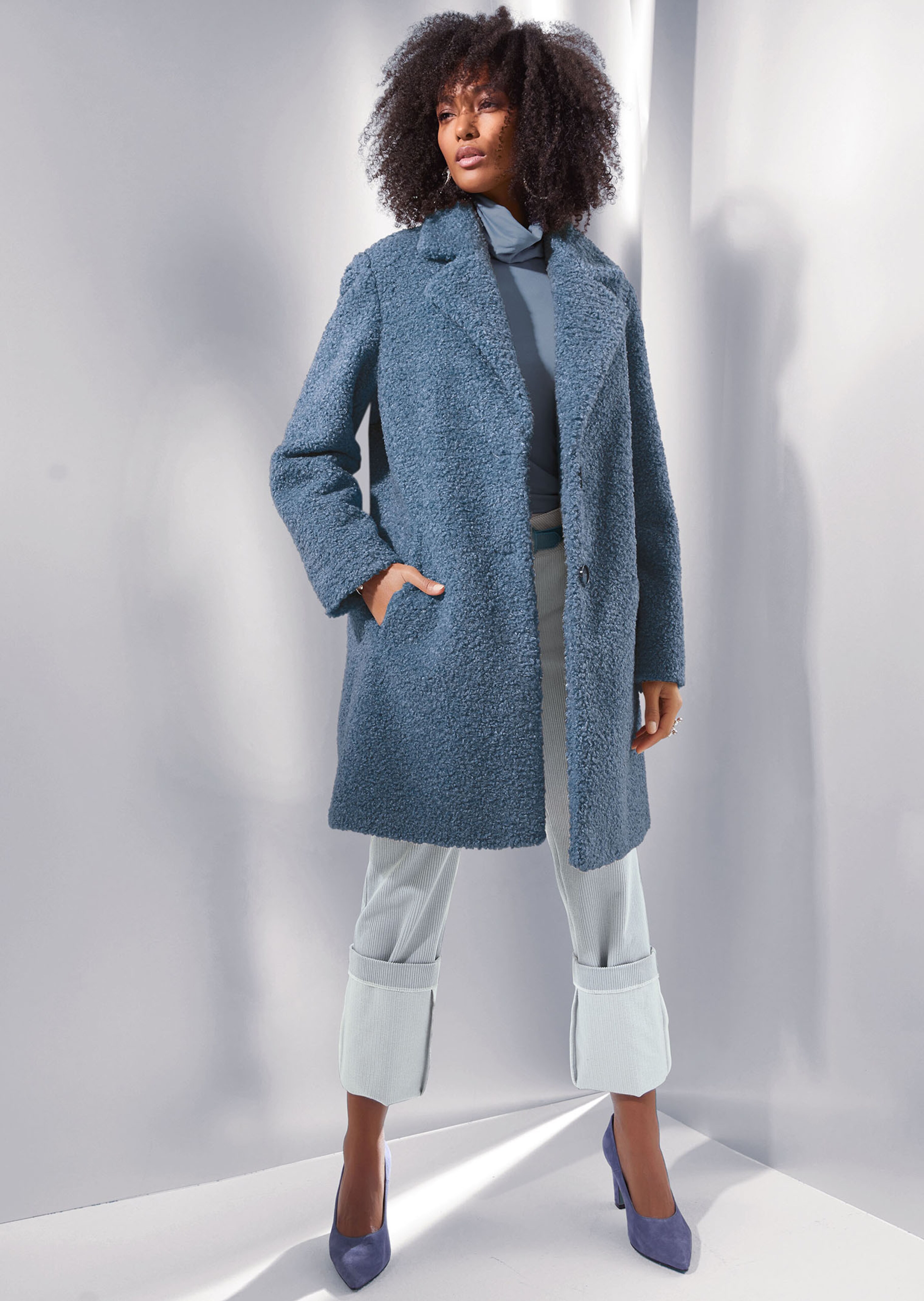 Im kuscheligsten Trend des Winters bestimmt das Material den Look: Der softe Webpelz gefällt in modischer Teddy-Optik und gibt diesem Mantel den unwiderstehlichen Flausch-Charakter. Herrlich wärmend und komfortabel im Schnitt zeigt er sich in lässiger Eleganz und ist mit Kragen, Revers und Nahttaschen gestaltet. Tonige Knöpfe setzen stilvolle Akzente. Die sorgfältige Innengestaltung mit tonigem Futter und edlem Madeleine Kettenaufhänger rundet den Kurzmantel stilgerecht ab. Einfach einhüllen und wohlfühlen!