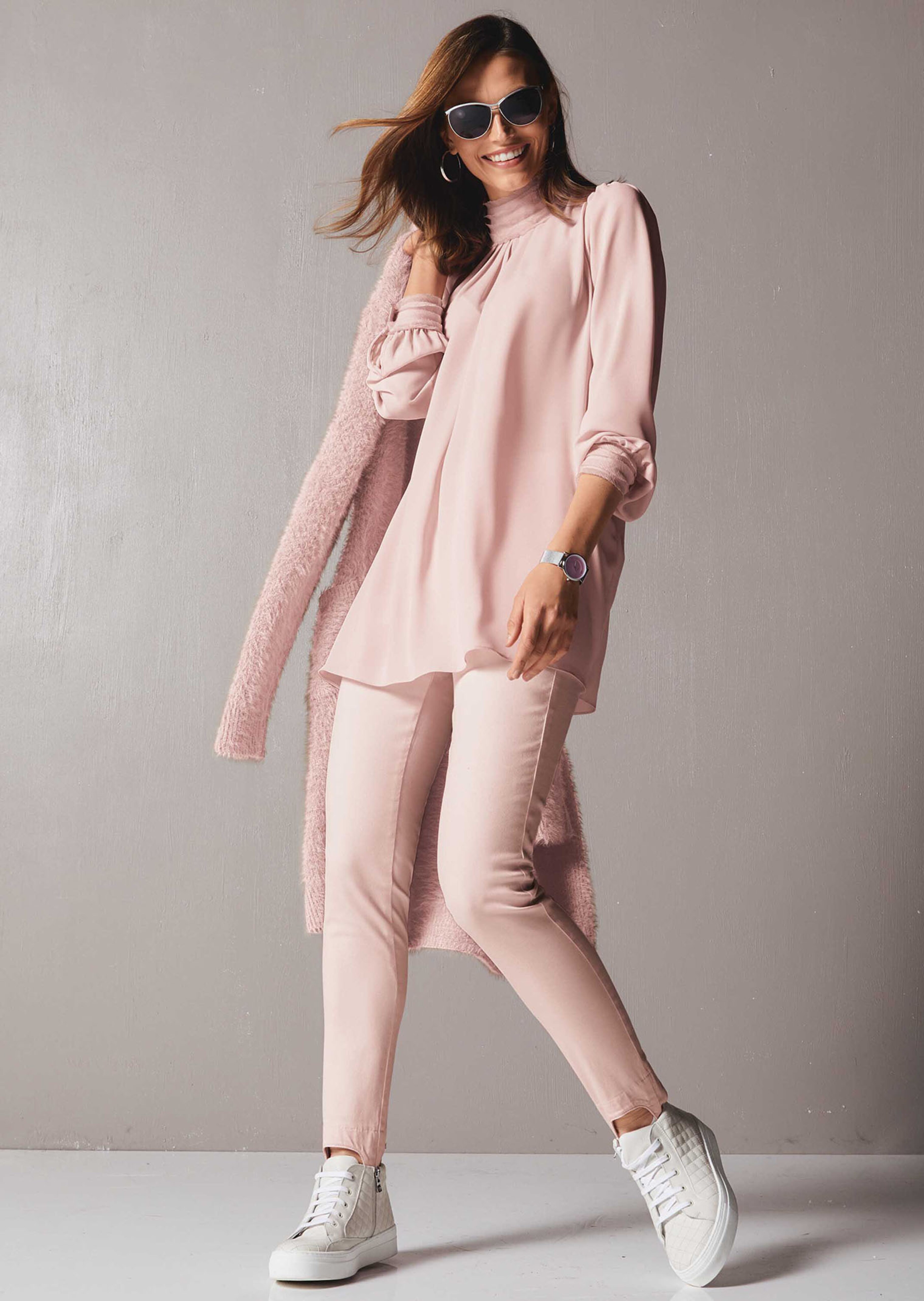 Weich fließende Oberteile lieben lässige Silhouetten! Das weite Hemd in ausgestellter Linie präsentiert sich mit feiner Transparenz und offenen Kanten am Stehkragen und den Knopf-Manschetten. Hübsche Faltenakzente setzen die Schulter und den Stehkragen in Szene. Mit Langarm, gerundetem Saum und rückseitigem Knopfverschluss wird das lange Hemd lässig außerhalb des Bundes getragen. Die unkomplizierte Qualität ist pflegeleicht und kofferfreundlich, so sind Sie auch auf Reisen im Handumdrehen top gestylt.
