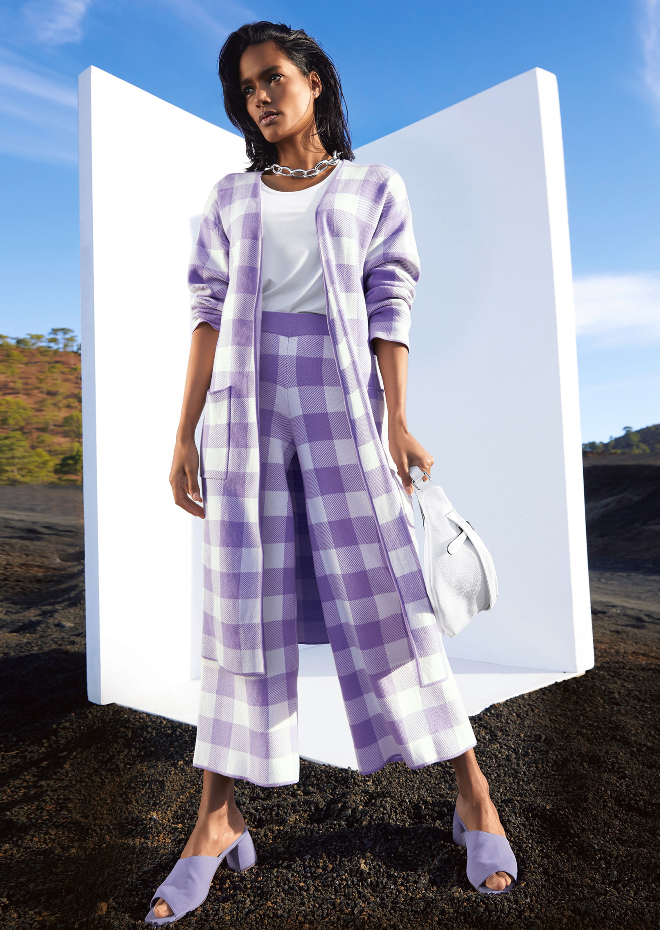 Modieus casual culotte-variant in waardevolle jacquard met ruit; licht uitlopend en mooi in model gebreid met een brede, elastische tailleband en modieuze, mooi omgeslagen uiteinden.