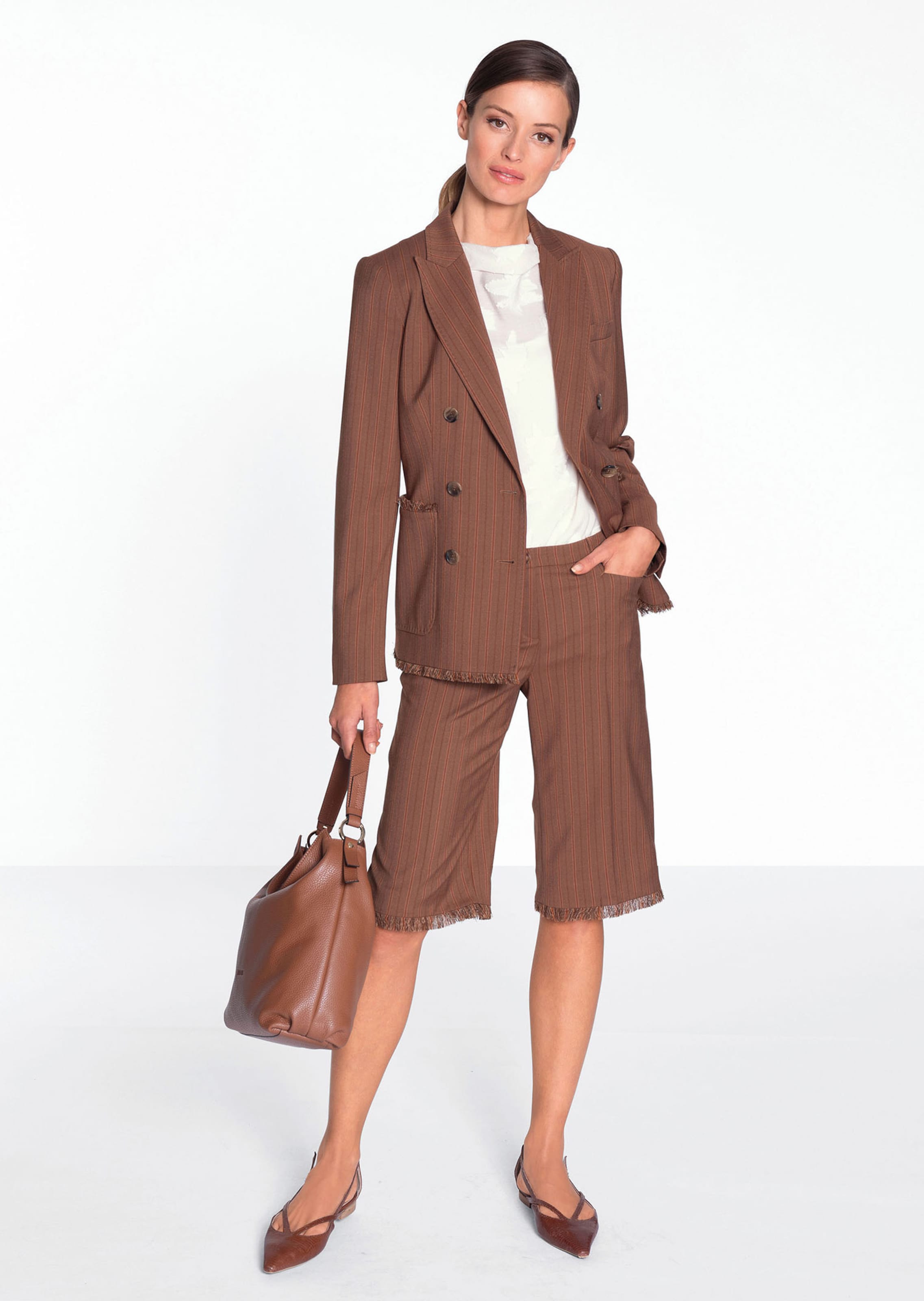 In zachte Italiaanse kwaliteit met harmonieus gekleurde, geweven strepen. Smal, recht model met vormgevende tailleband, knopen in hoornoptiek, franjezoom, steekzakken voor en achterzakken met knopen en bies.