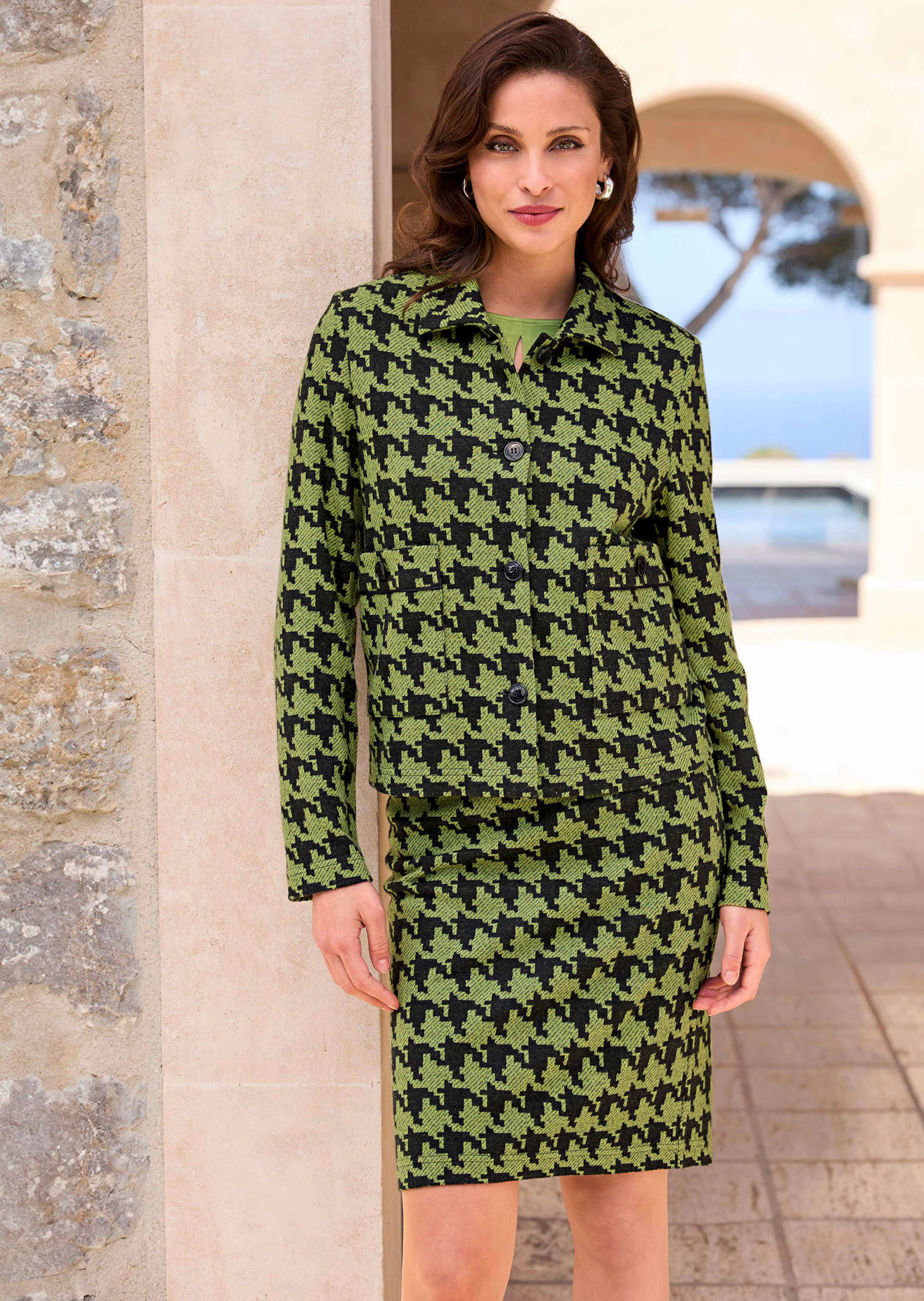 Met aantrekkelijk pied-de-poule-dessin. Kleine schoudervullingen. Knopenlijst met drie grote knopen. Opgestikte zakken met decoratieve paspelering en knoop.