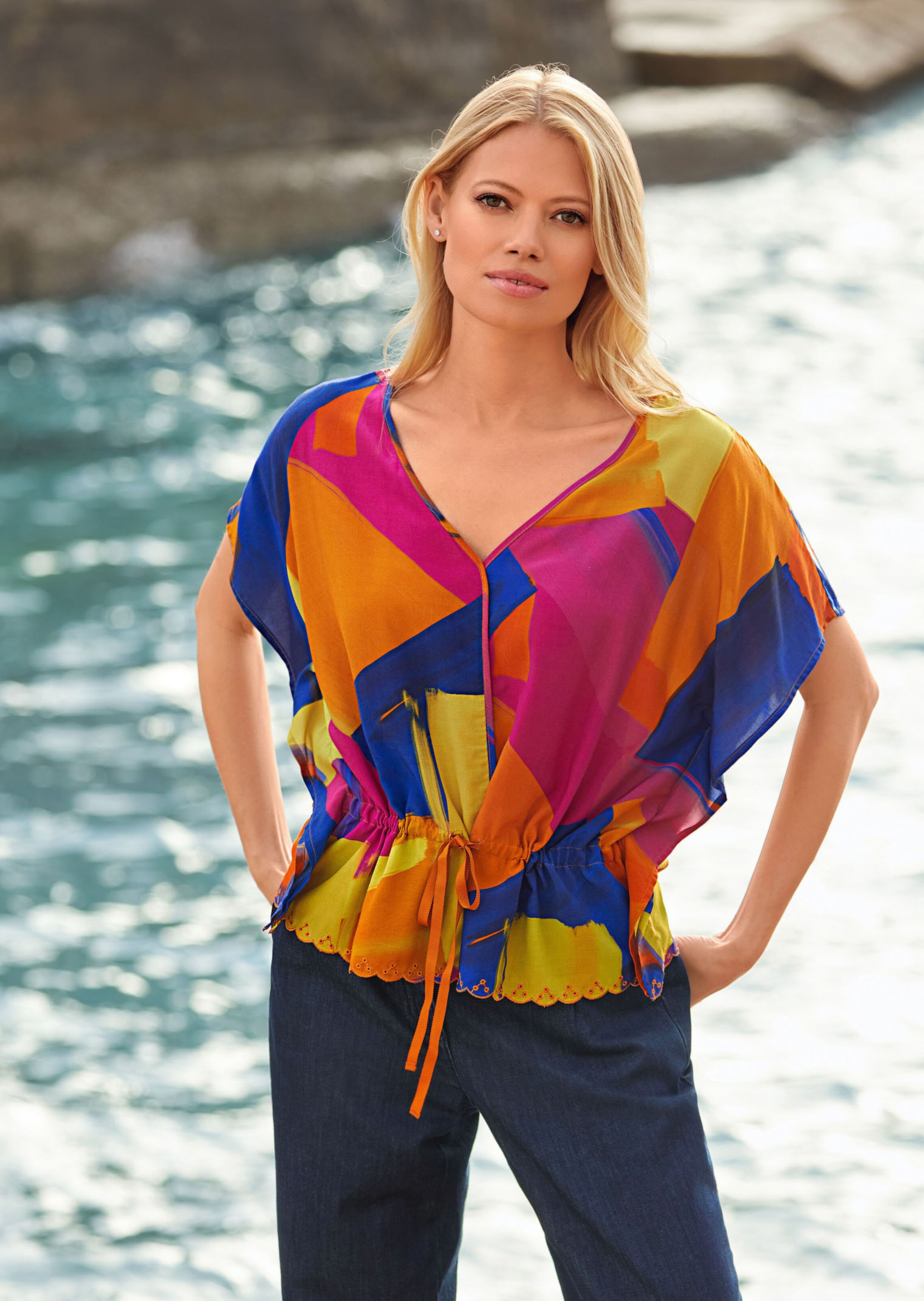 Met een unieke print in vrolijke kleuren, aangeknipte mouwen, een taillebies van satijn en gaatjesstiksel aan de zoom.