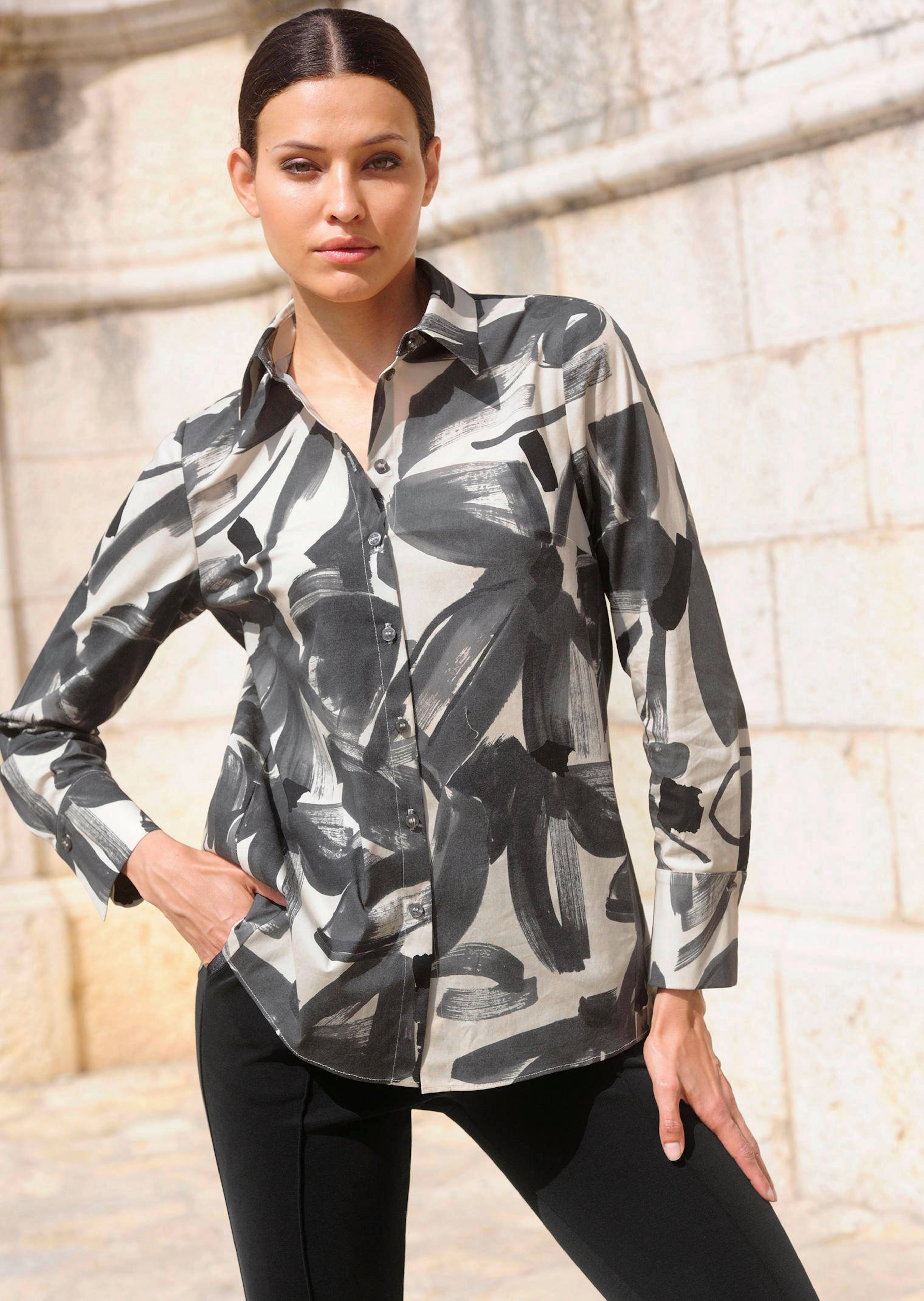 • Bluse mit Hemdkragen und Knopfleiste, Vorverlegte Seitennaht mit Eingriffstaschen, Langarm mit breiter Manschette, Rückenpasse mit Kellerfalte, Idealer Kombipartner, Optimale Bewegungsfreiheit