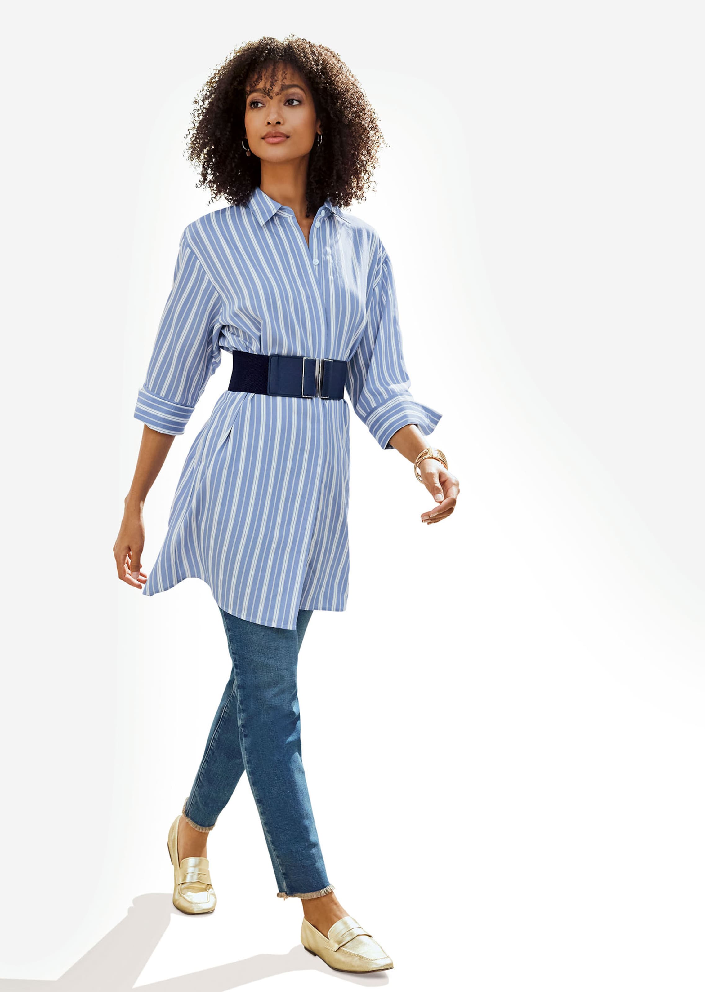 In een trendy oversized look! Figuurflatterend, lang model in contrasterend geweven streepdessin met overhemdkraag, blinde knoopsluiting en rugpas. 3/4-mouwen met brede manchetten met knopen.