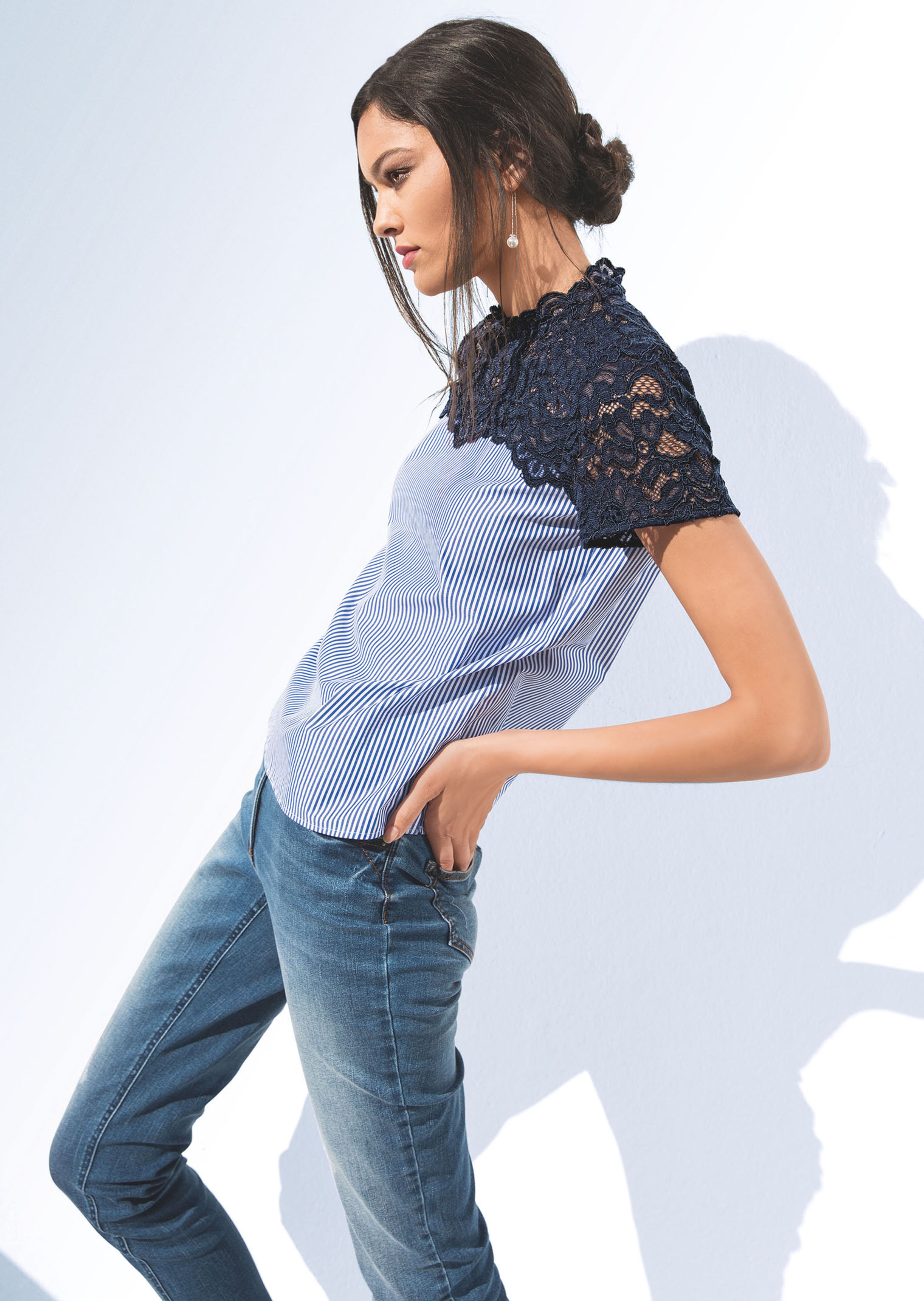 In een materiaalmix. Het kant voor en achter met golvende randen is transparant. De katoen met fijne strepen staat hiermee in contrast. Casual model met klein, opstaand kraagje, korte mouwen en splitjes opzij.