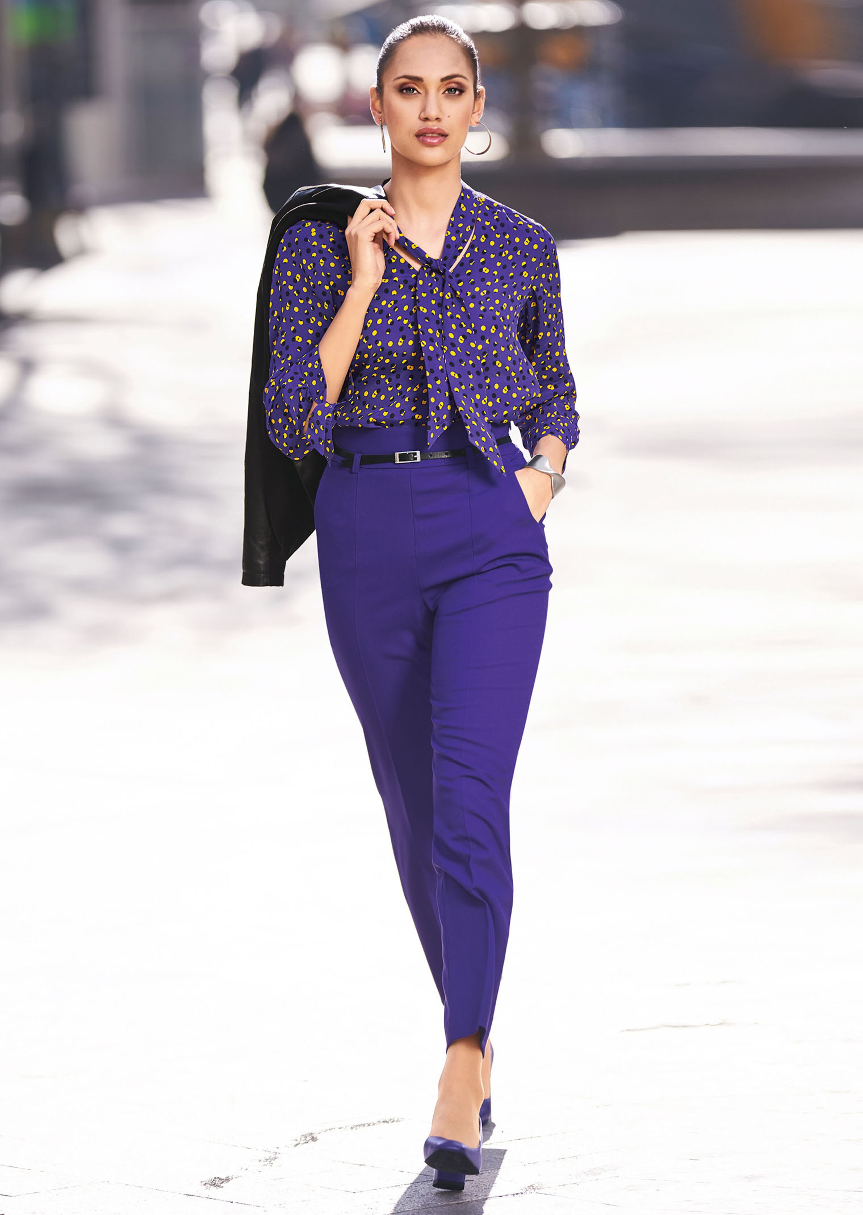 In comfortabele ceramica-kwaliteit. Tot op de enkels vallend highwaist-model met steekzakken en ritssluiting opzij in de naad. Met riem van imitatieleer.
