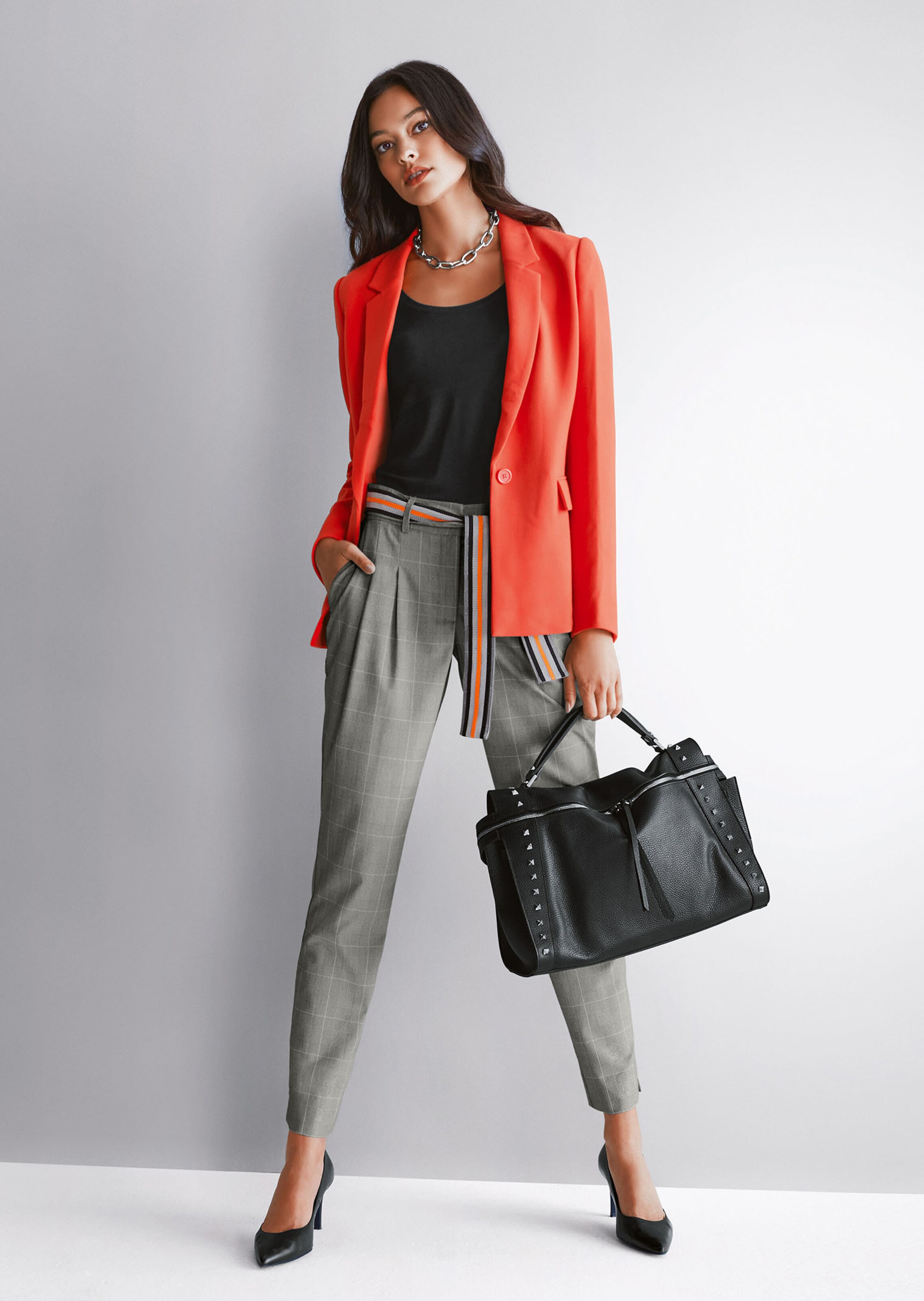 Met neonkleurige accenten. Bandplooibroek met strikceintuur, modellerende tailleband, steekzakken en zoomsplitjes.