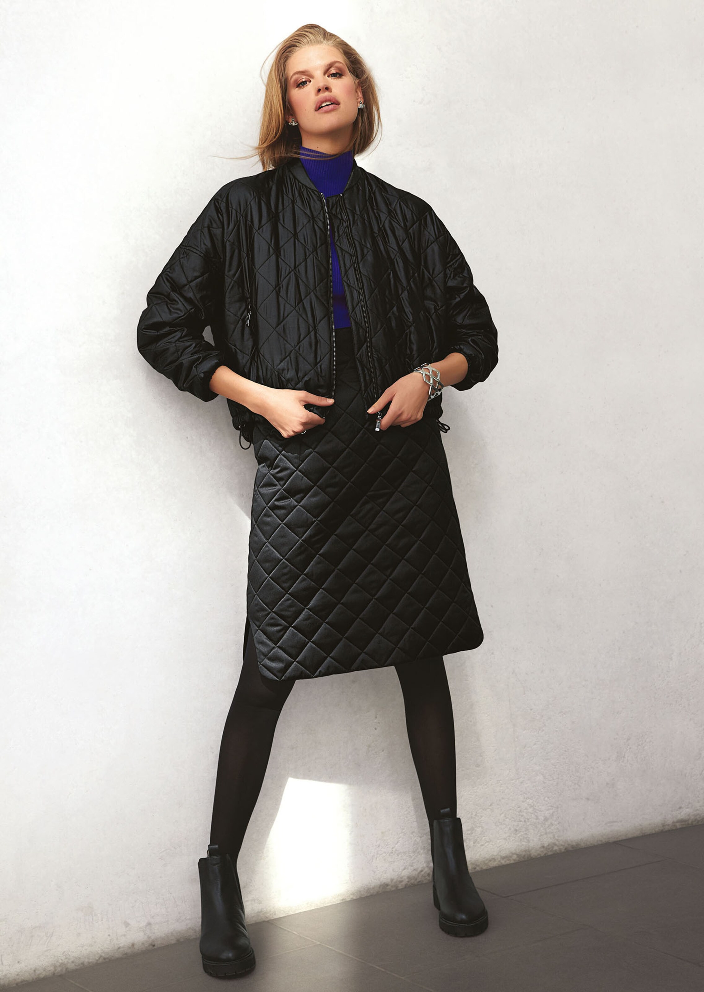 Stijlvolle winterfavoriet met decoratief ruitstiksel. Modieuze highwaist-stijl in licht uitlopende lijn; met gestreken vouwen aan de voorkant, zakken in de naad opzij en afgeronde splitten opzij. Rits achter in de naad.